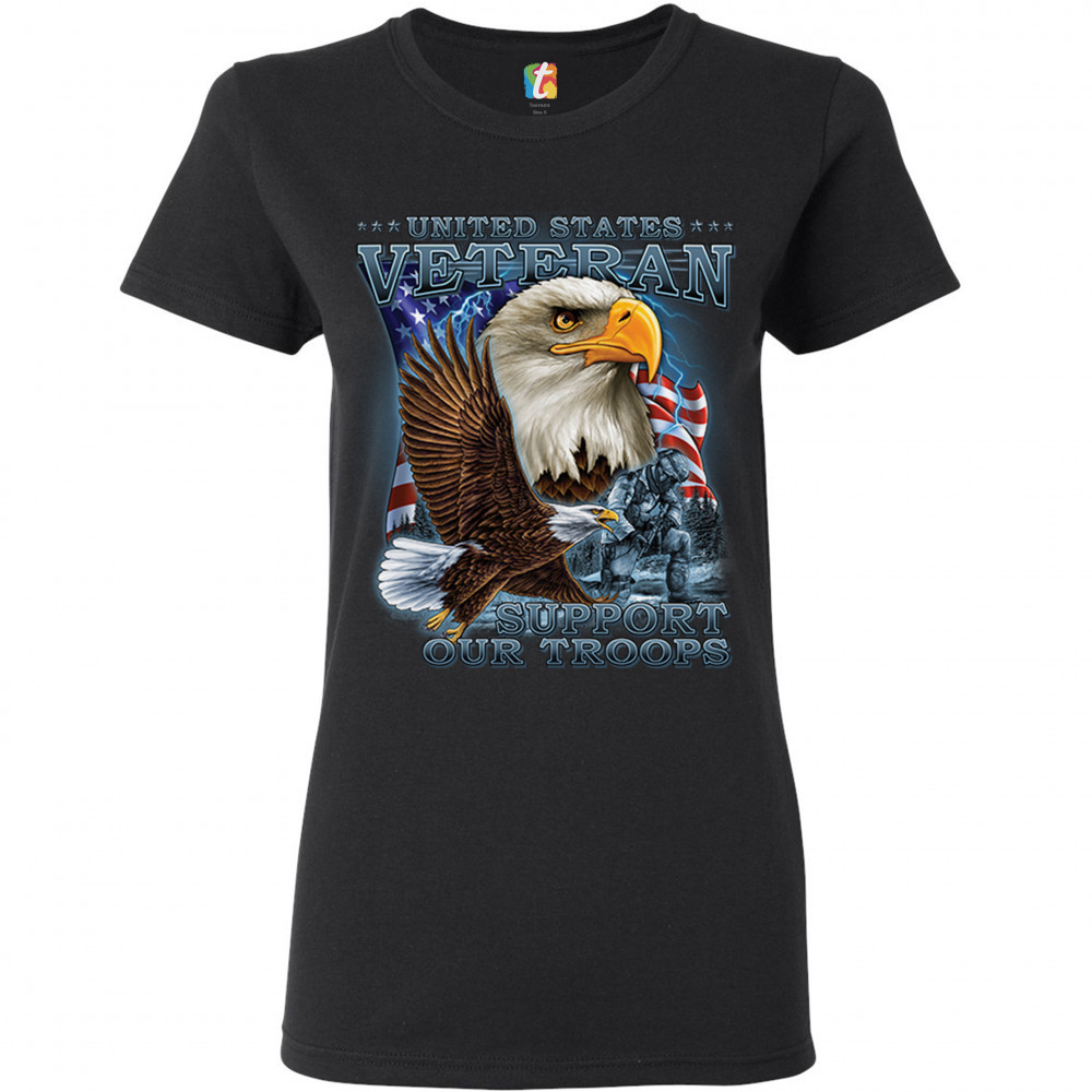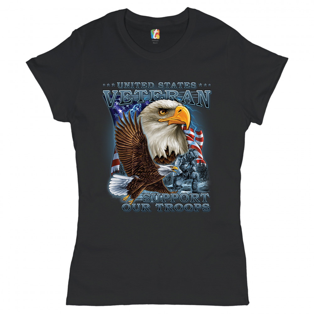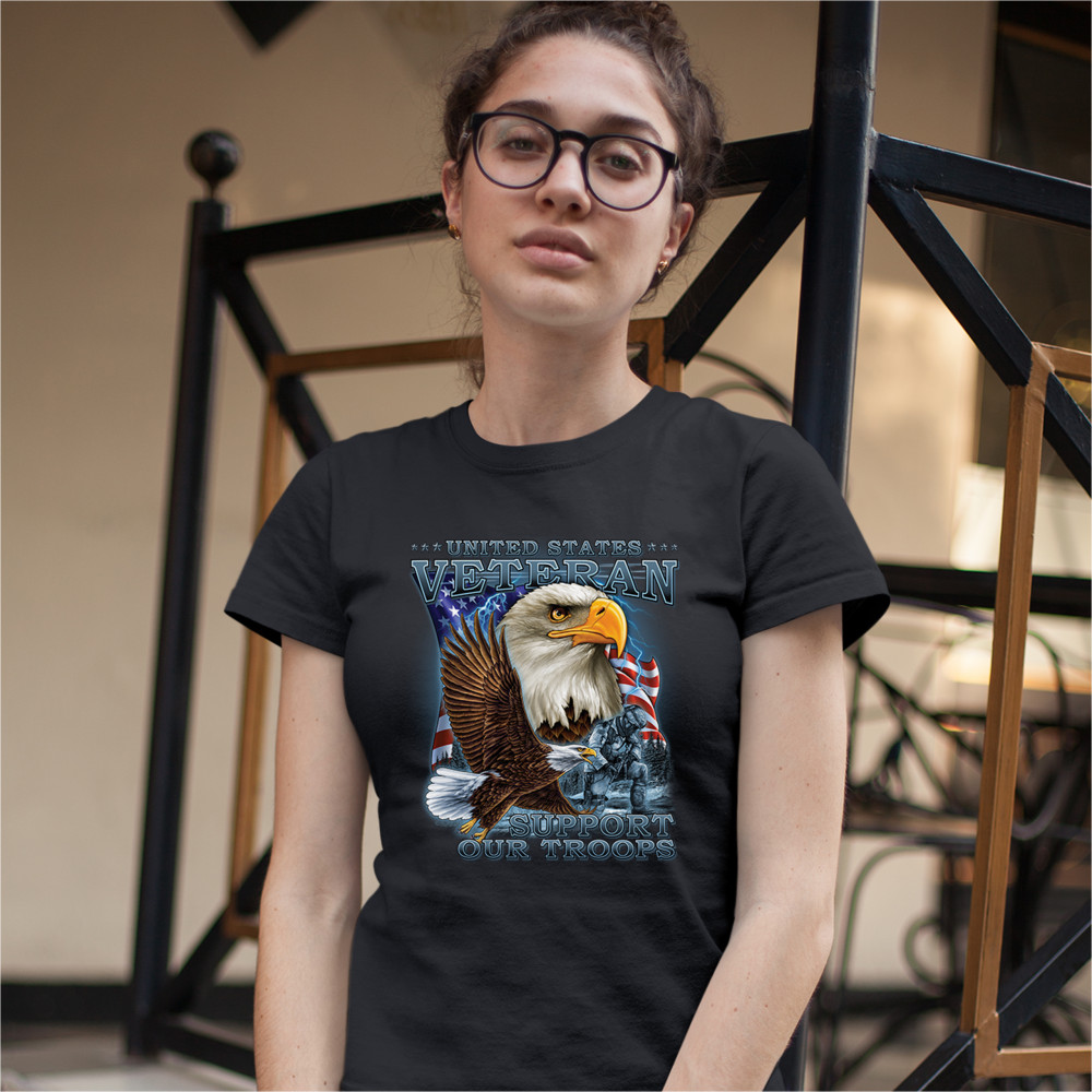 A patriotic print featuring a flying American bald eagle. There is another bald eagle covering most of the American flag in the background. There is a kneeling soldier in the front. The print says: "United States Veteran, Support our Troops". A great choice for a true patriot of the USA