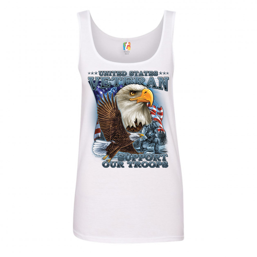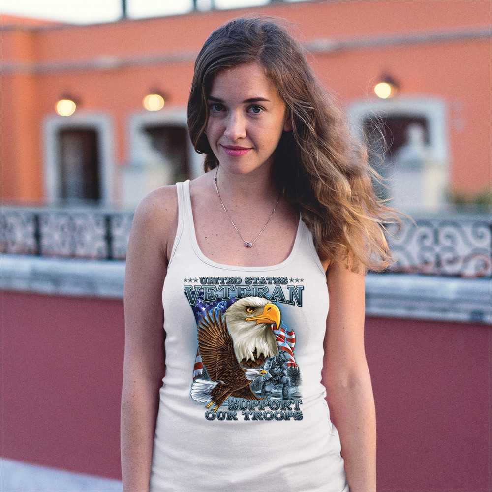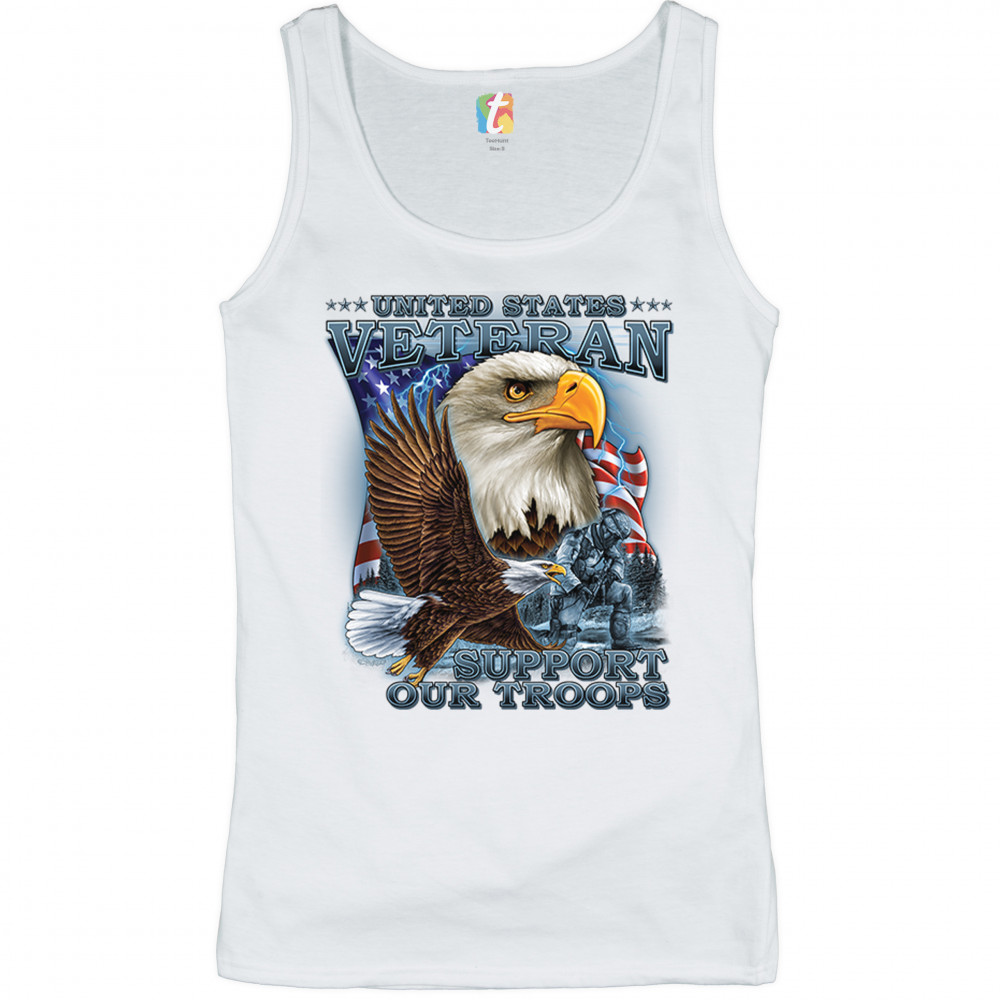 A patriotic print featuring a flying American bald eagle. There is another bald eagle covering most of the American flag in the background. There is a kneeling soldier in the front. The print says: "United States Veteran, Support our Troops". A great choice for a true patriot of the USA