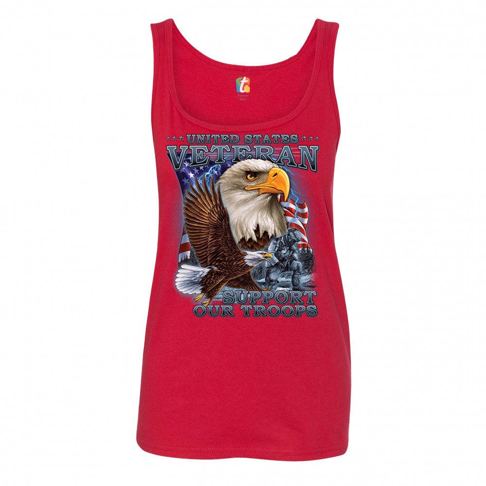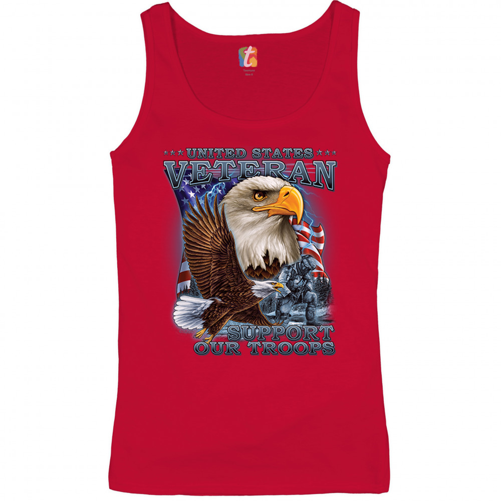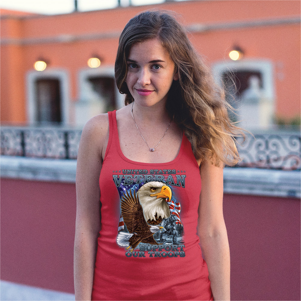 A patriotic print featuring a flying American bald eagle. There is another bald eagle covering most of the American flag in the background. There is a kneeling soldier in the front. The print says: "United States Veteran, Support our Troops". A great choice for a true patriot of the USA