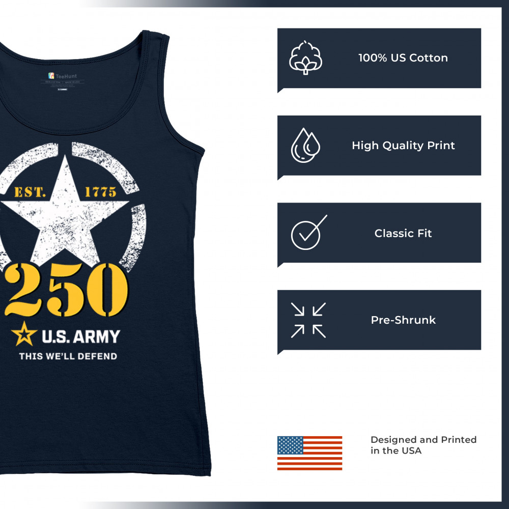 Celebrate 250 years of U.S. Army duty and pride with bold stencil design, EST 1775 mark, and patriotic “This We’ll Defend†motto.