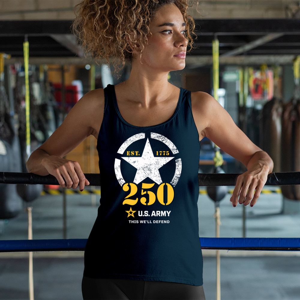 Boldly marking the U.S. Army’s 250th anniversary, this design includes a distressed white star, 1775 EST detail, and bold yellow “250†typeface beneath the iconic motto “This We’ll Defend.†A fitting tribute for veterans, service members, and families who want to show respect and pride during military observances or patriotic events.