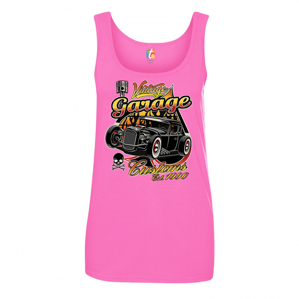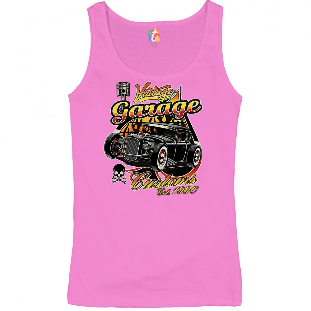 A print featuring a lowrider hot rod, a small skull with crossed wrenches instead of bones, a piston and an ace of spades in the background. The orint says: "Vintage Garage Customs Est. 1990". A great choice for a fan of customized American classic cars a