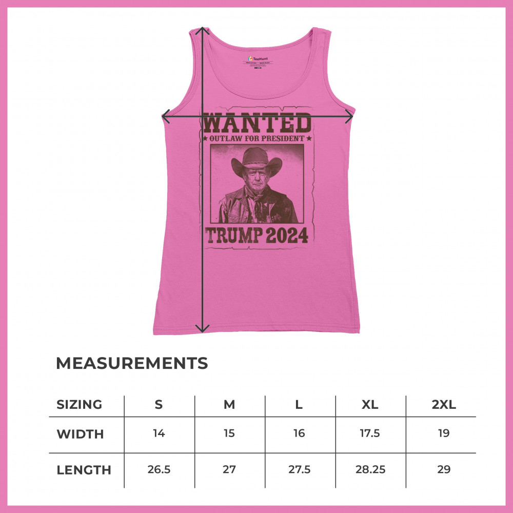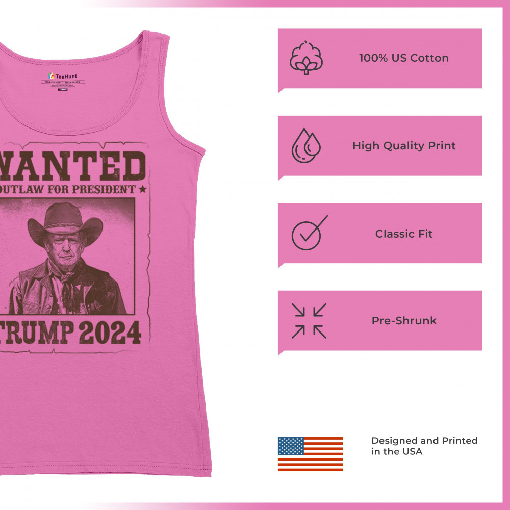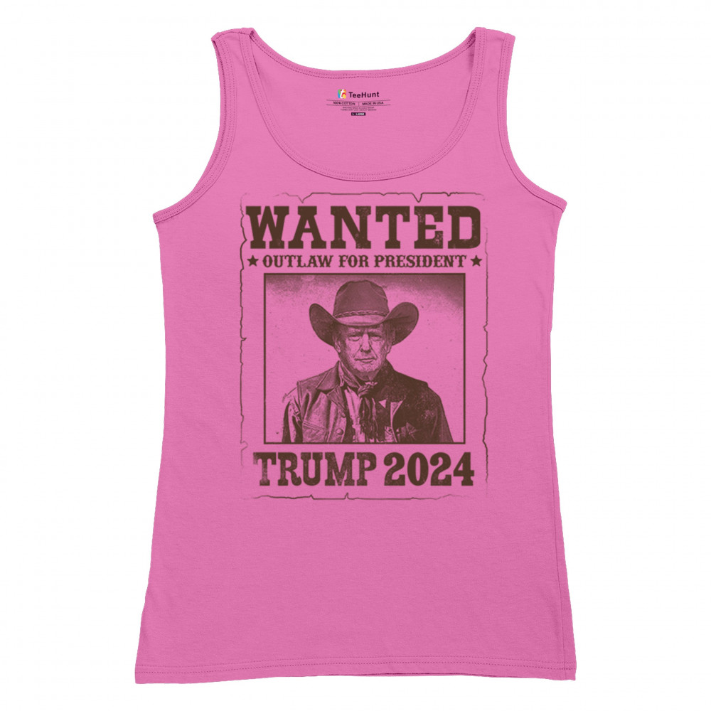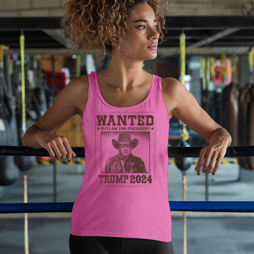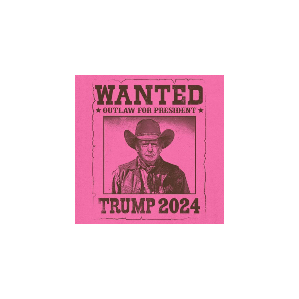 Bold "Wanted: Outlaw for President" design featuring Trump in cowboy attire, perfect for rally-goers and supporters. Express your support for the 2024 election.