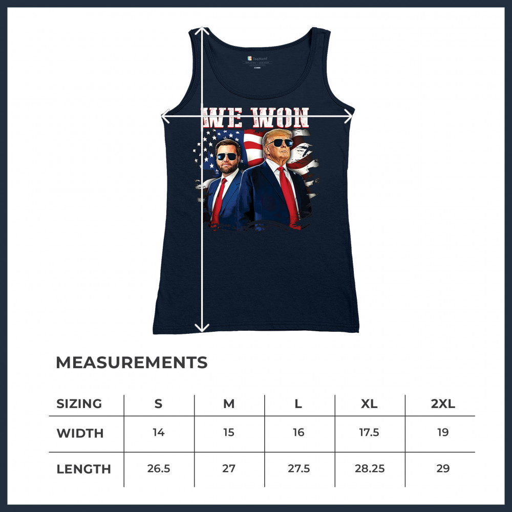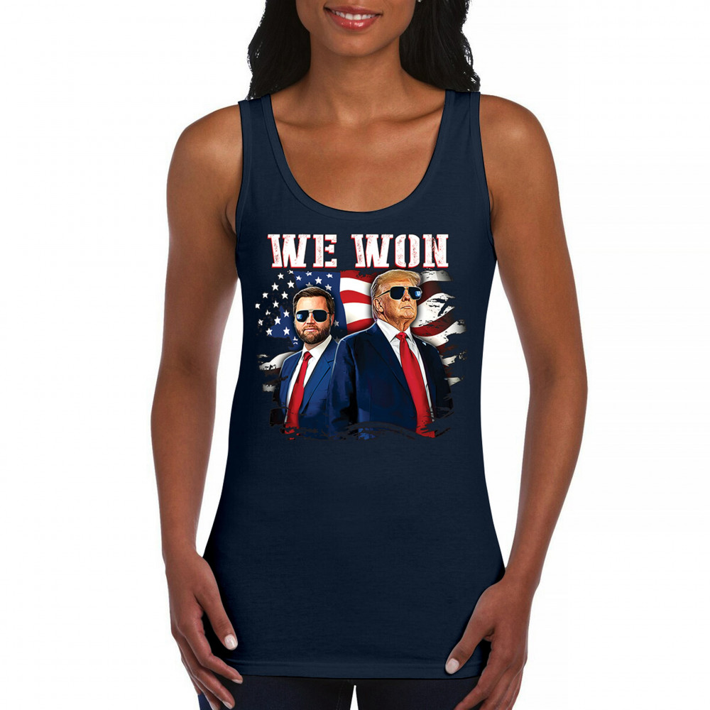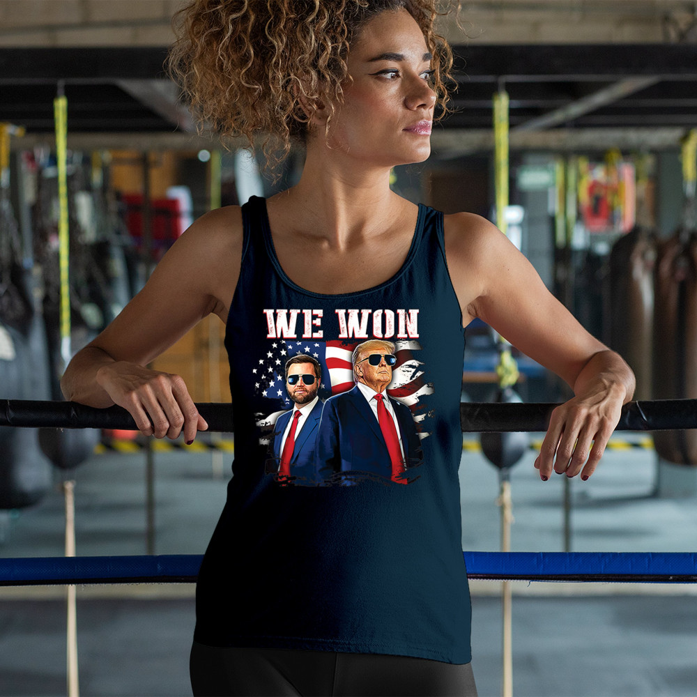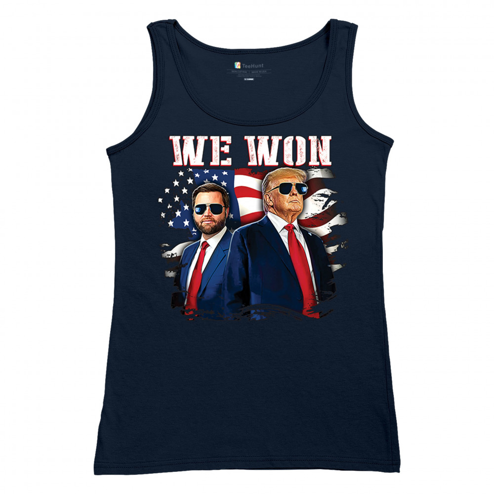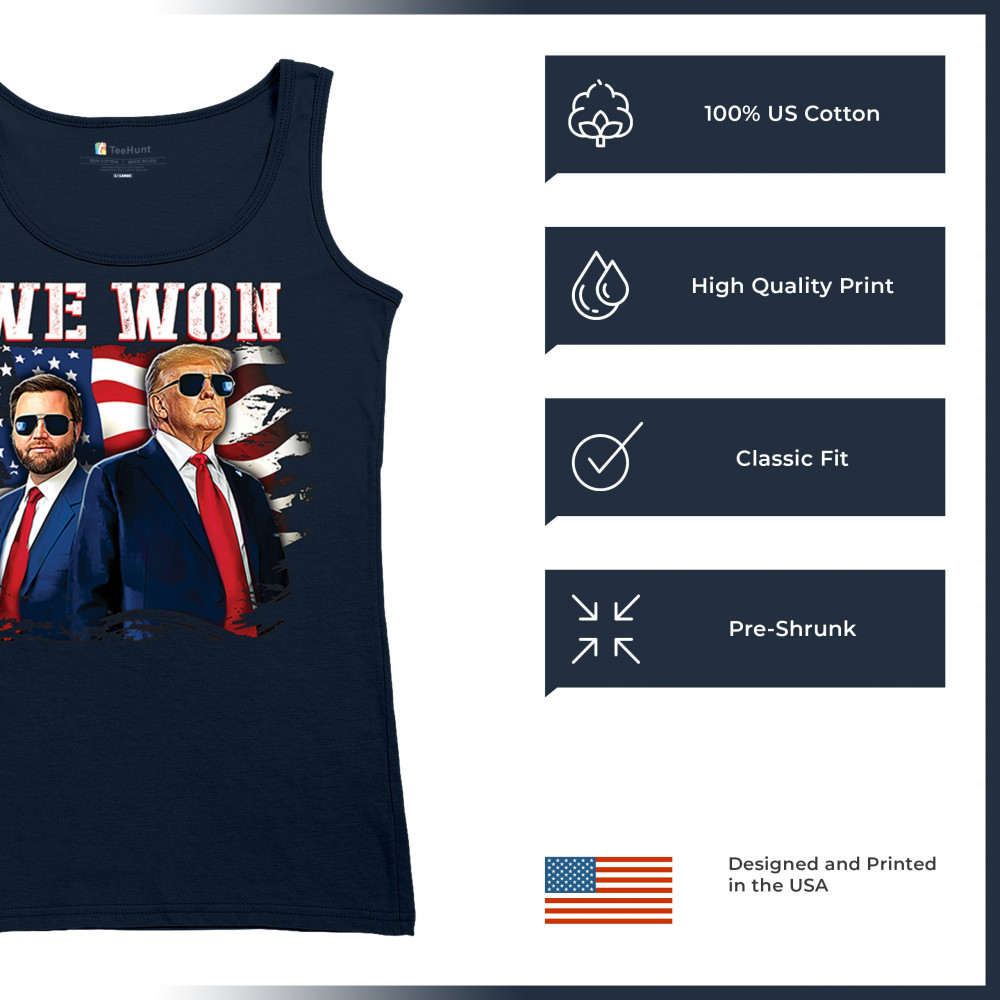 Celebrate Republican victory with this bold "We Won" design featuring Trump and patriotic flair—perfect for rallies, events, and patriotic pride.
