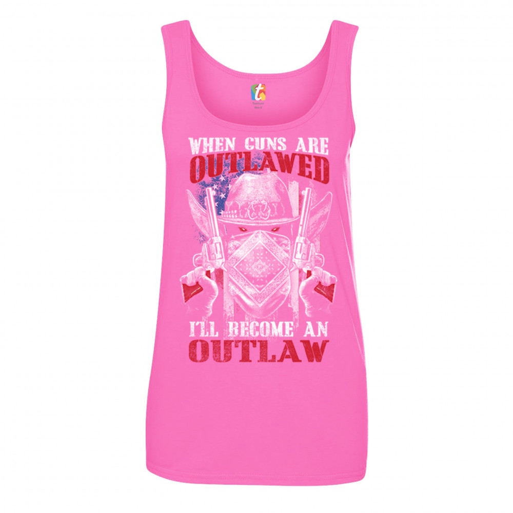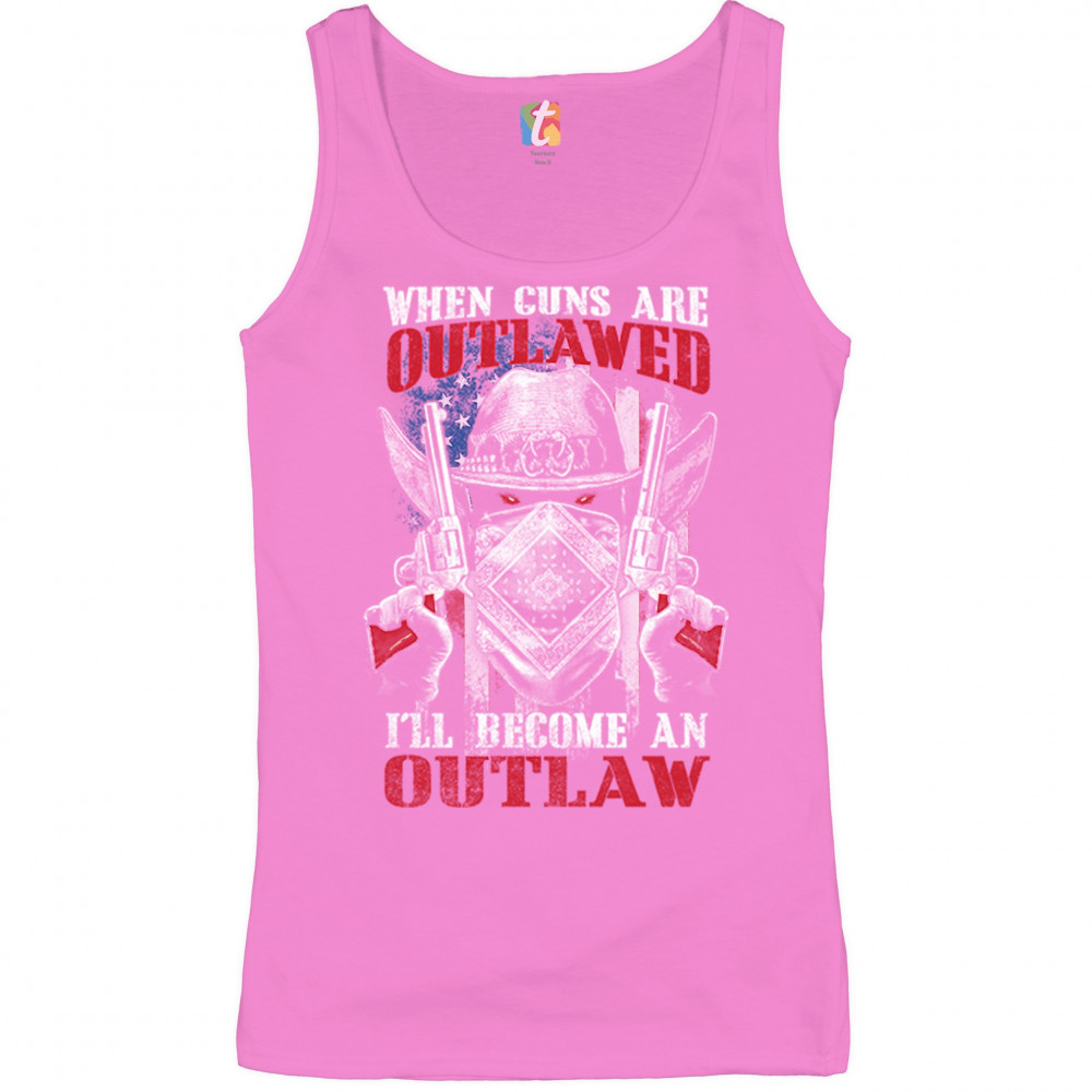 A print featuring a head wearing a cowboy hat and a bandana which covers most of the face, leaving only the red eyes to be seen. In each hand the person is holding a revoler and in the background there is the American flag. The print says: "When Guns Are