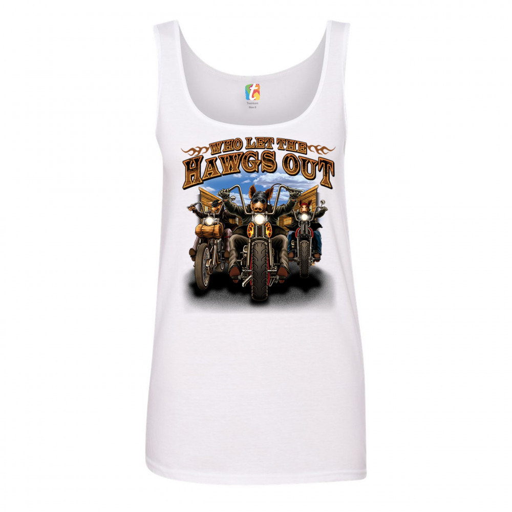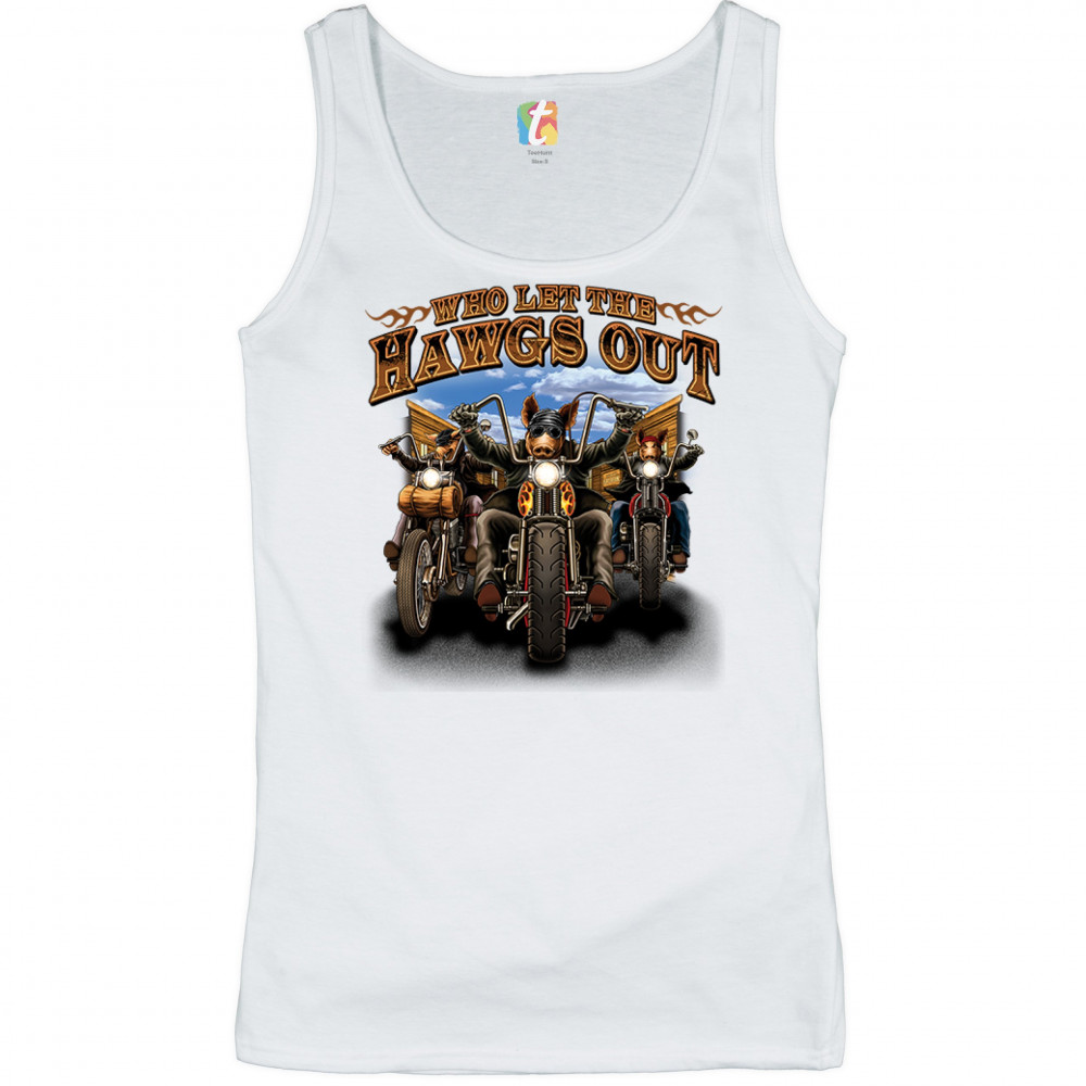 WHO LET THE HAWGS OUT women's tank top biker motorcycle gang live to ride white