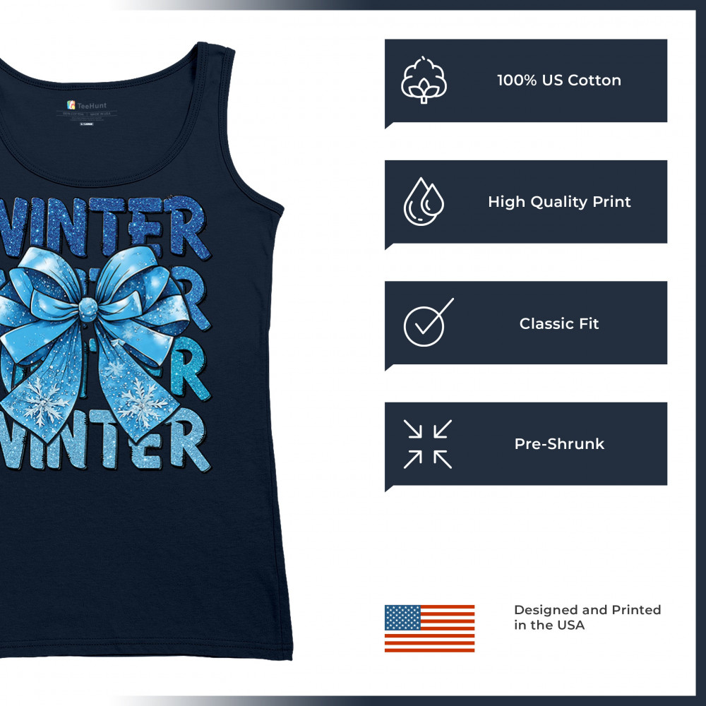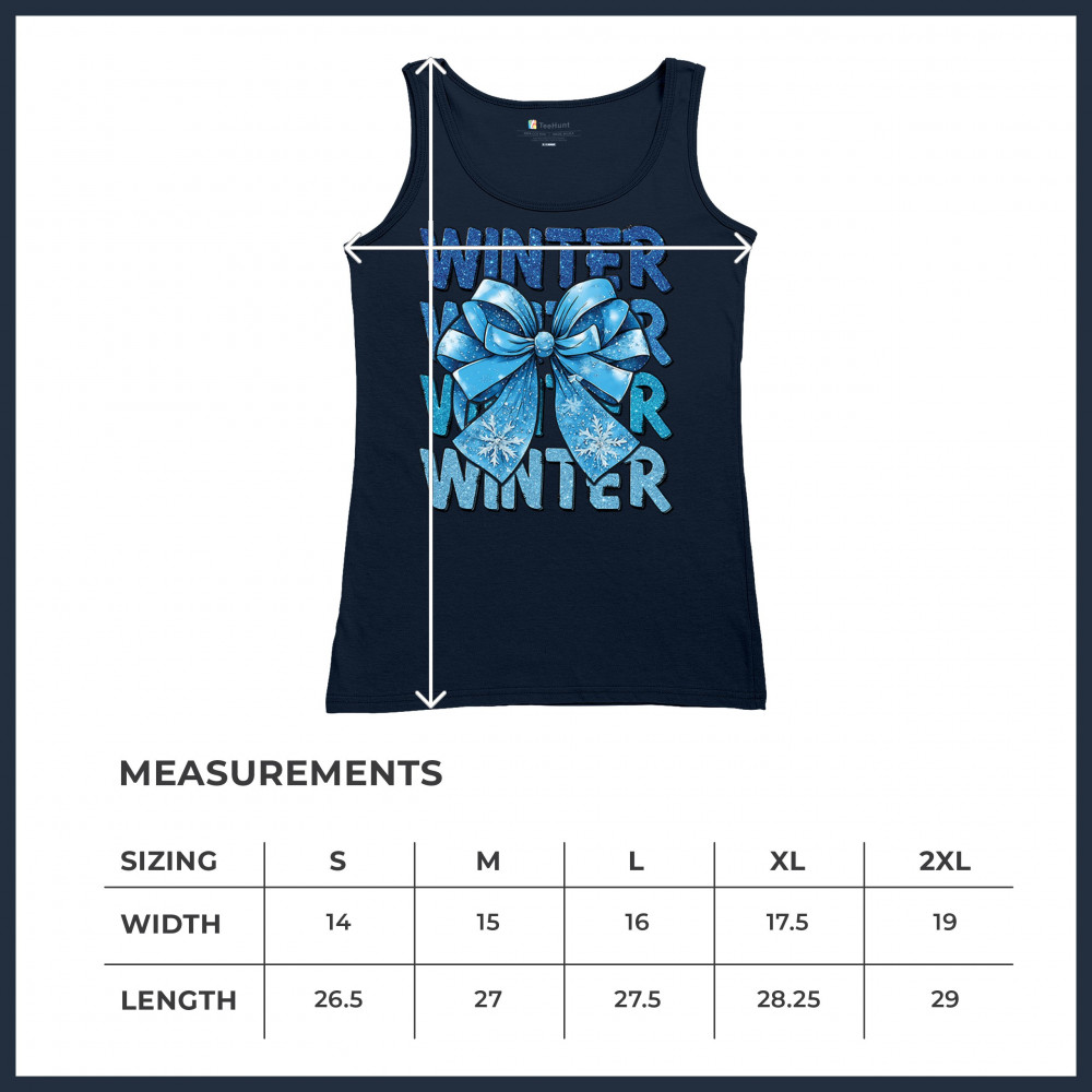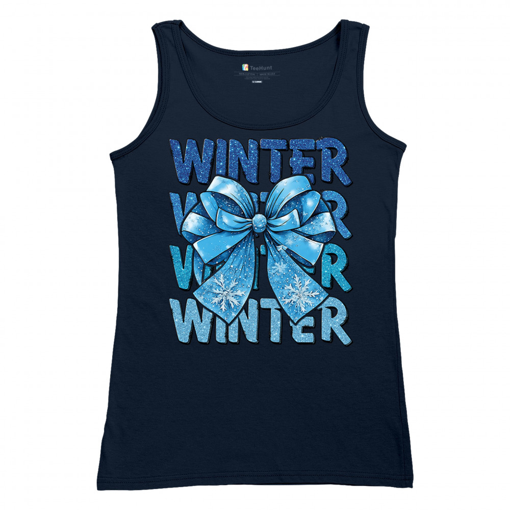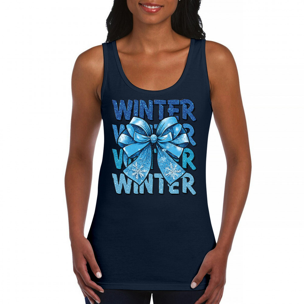 This shimmering winter bow design blends icy blue glitter style with bold repeating WINTER text for a bright seasonal statement. Snowflake accents and frosty tones create a cozy, cheerful vibe perfect for holiday outfits, gifting, or cold-weather lovers. A standout graphic that brings festive winter charm to any wardrobe and boosts seasonal search visibility.
