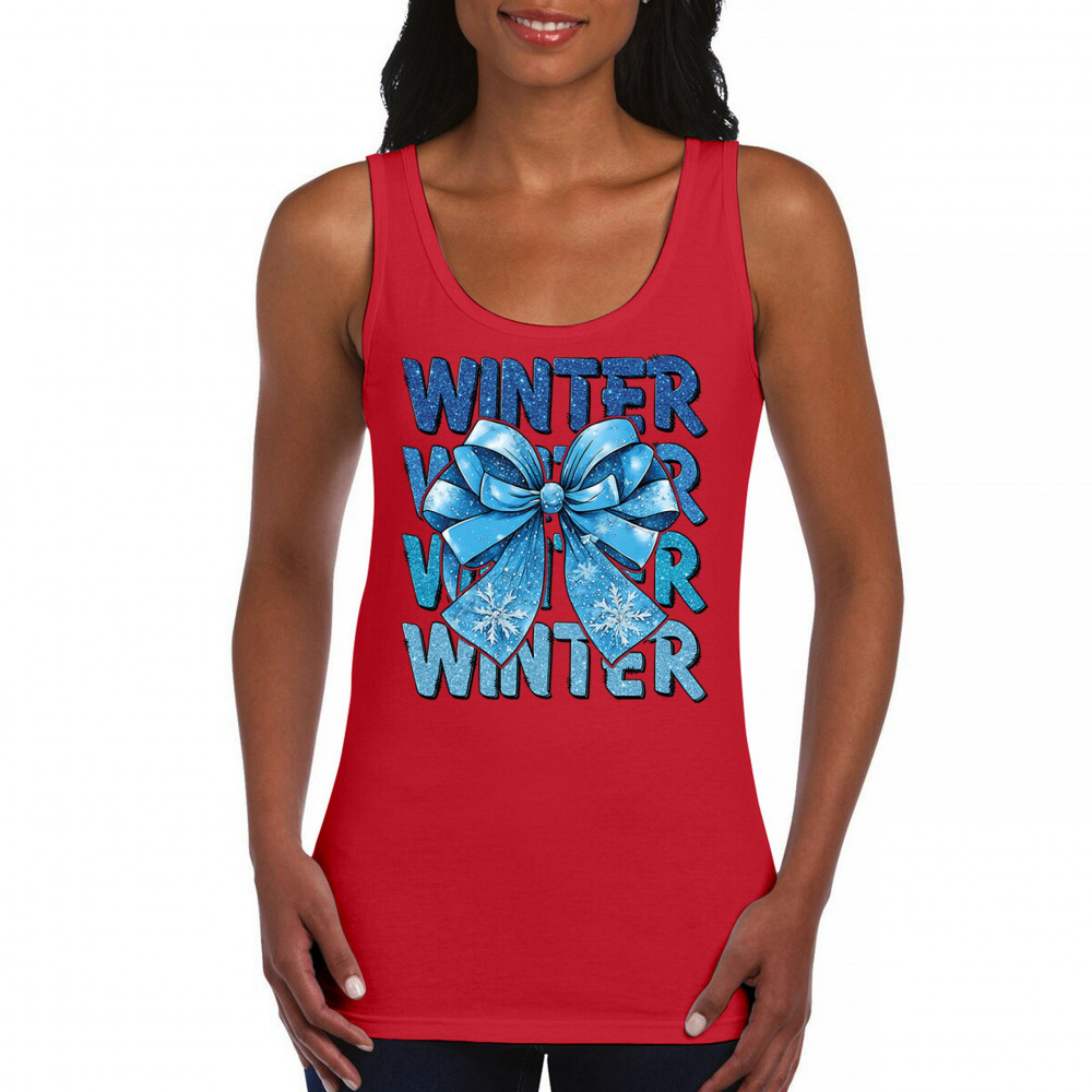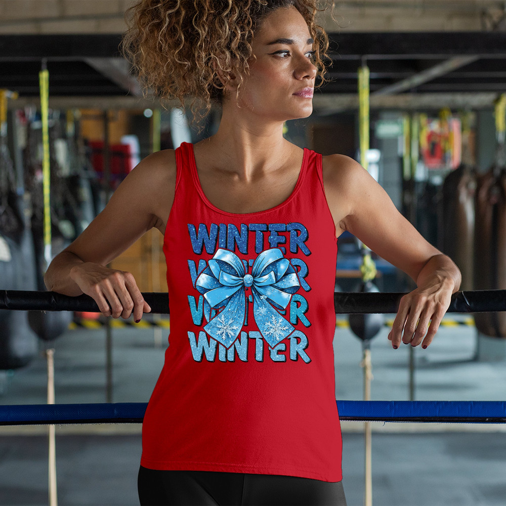 This shimmering winter bow design blends icy blue glitter style with bold repeating WINTER text for a bright seasonal statement. Snowflake accents and frosty tones create a cozy, cheerful vibe perfect for holiday outfits, gifting, or cold-weather lovers. A standout graphic that brings festive winter charm to any wardrobe and boosts seasonal search visibility.