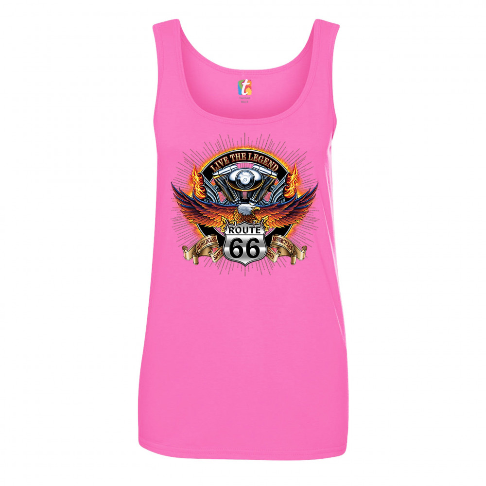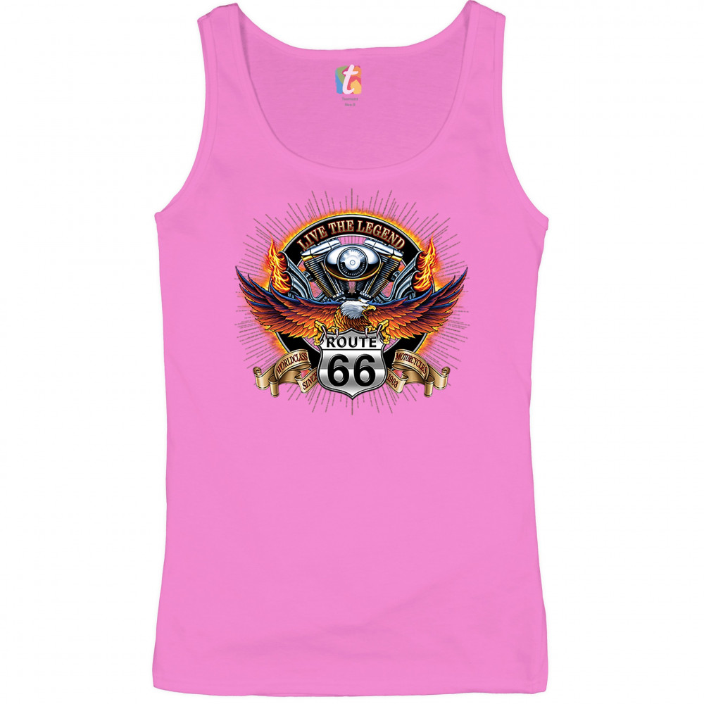 A print featuring an American bald eagle spreading it's wings while sitting on a "Route 66" sign. On a stripe behind the sign it says: "worldclass motorcycles since 1903". In the background there is a motorcycle engine with words: "live the legend" above
