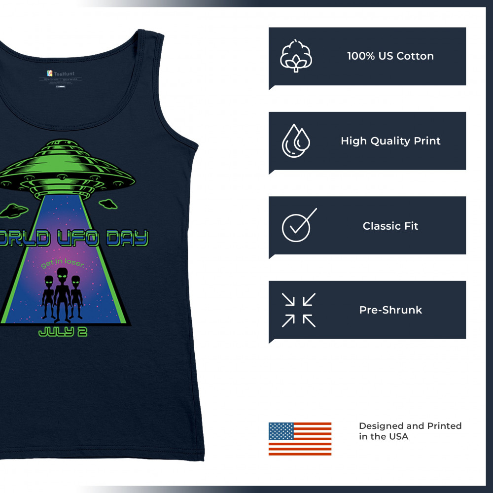 Celebrate World UFO Day with a vibrant design featuring a UFO and three playful aliens with "Get in, loser." Perfect for UFO enthusiasts and alien humor lovers.