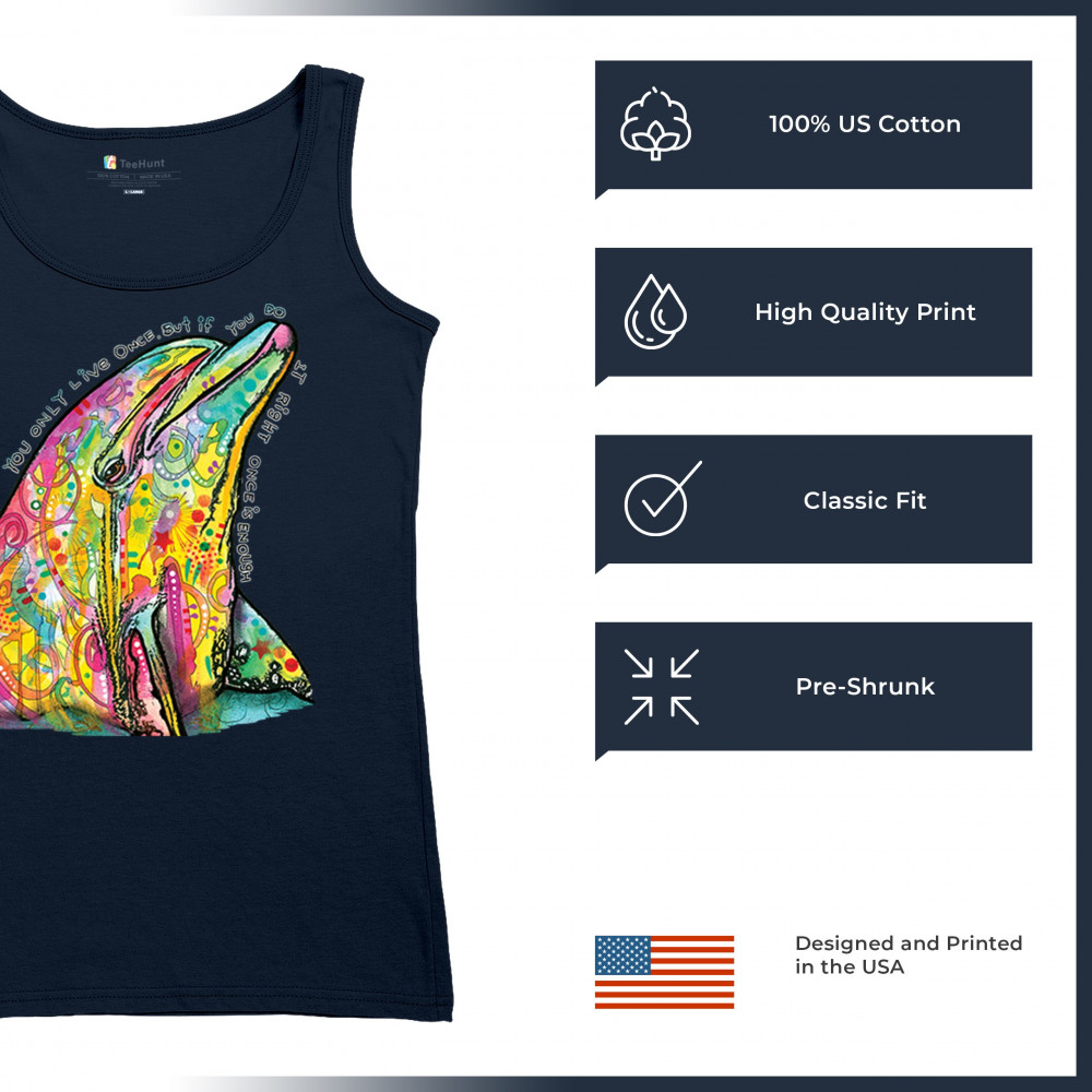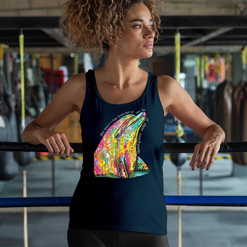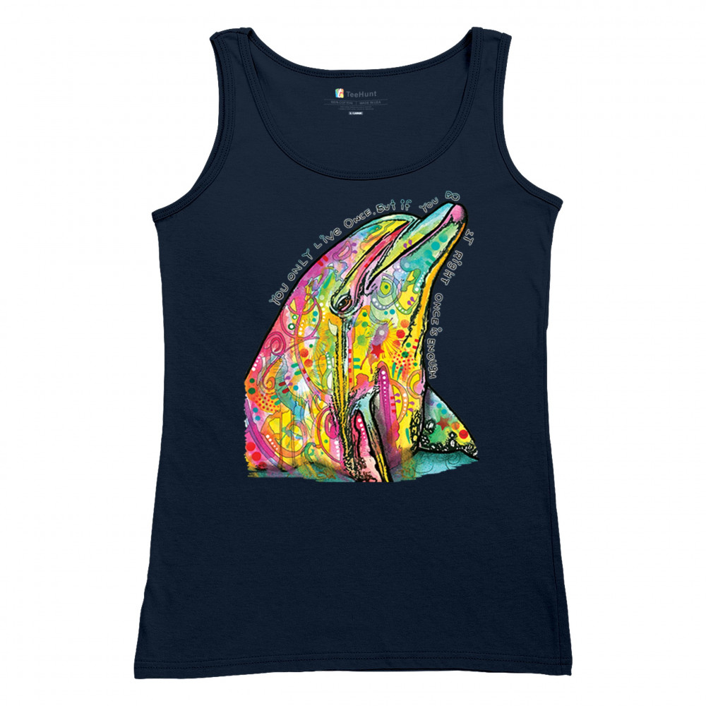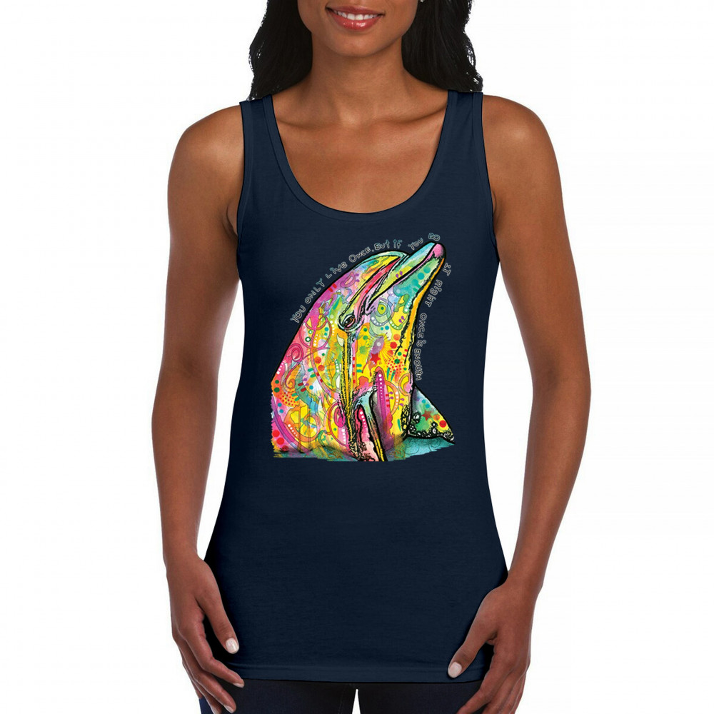 YOU ONLY LIVE ONCE women's tank top cute neon dolphin dean russo yolo navy blue