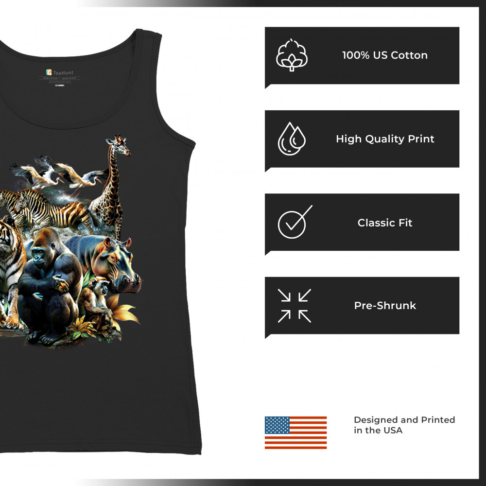 Packed with fierce energy and vibrant color, this wildlife design features a jungle coalition of gorilla, tiger, monkey, zebra, giraffe, hippo, and birds. A powerful tribute to animal beauty, biodiversity, and nature's harmony. Perfect for jungle tour enthusiasts, zoo visitors, or anyone passionate about wild conservation and stunning creature art.