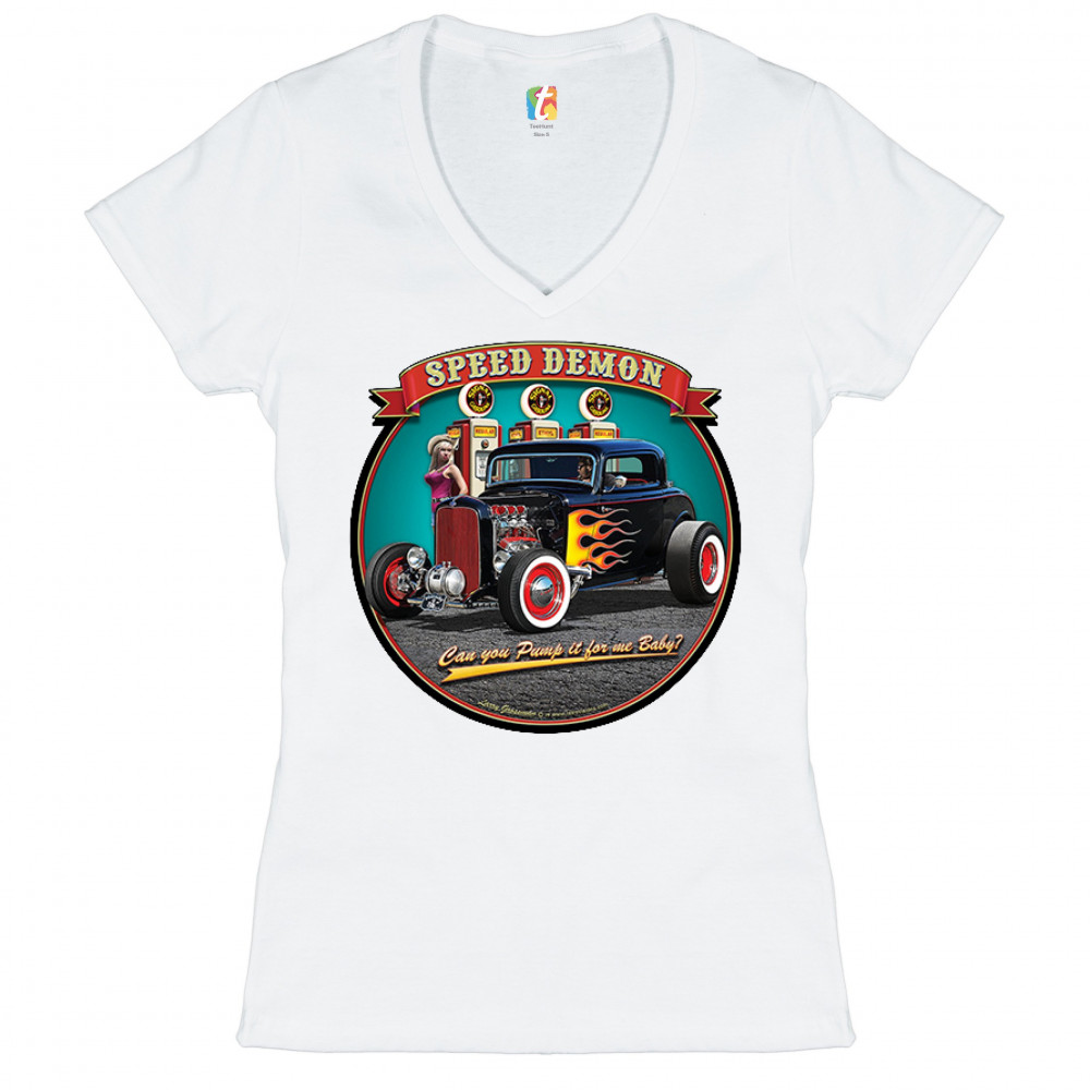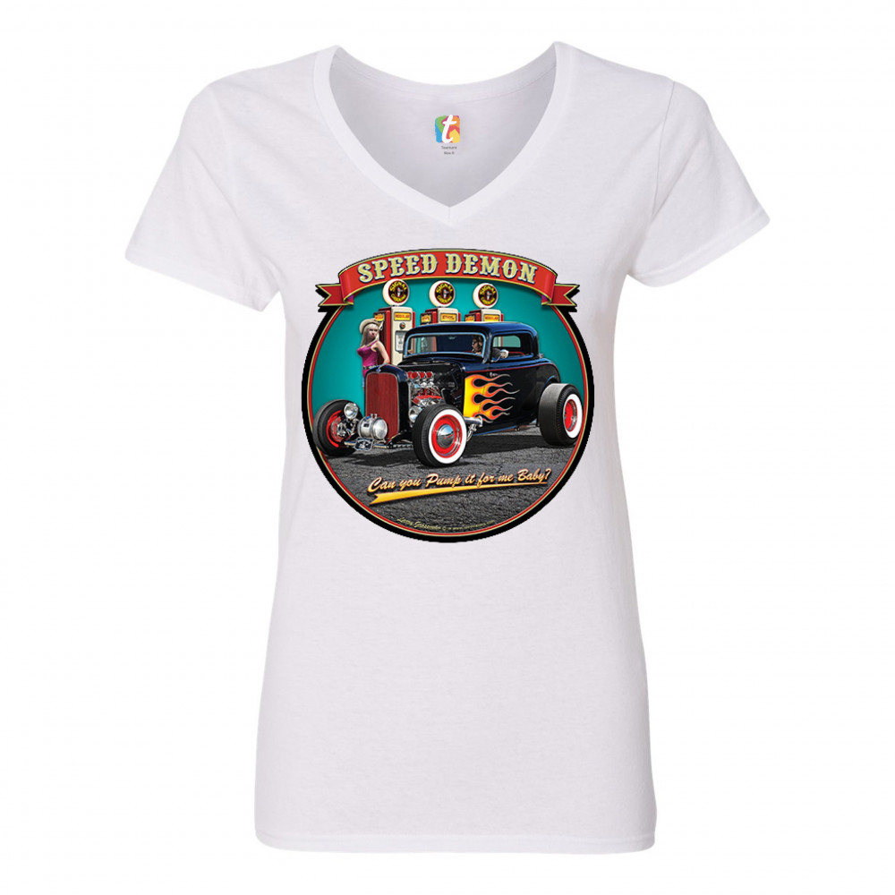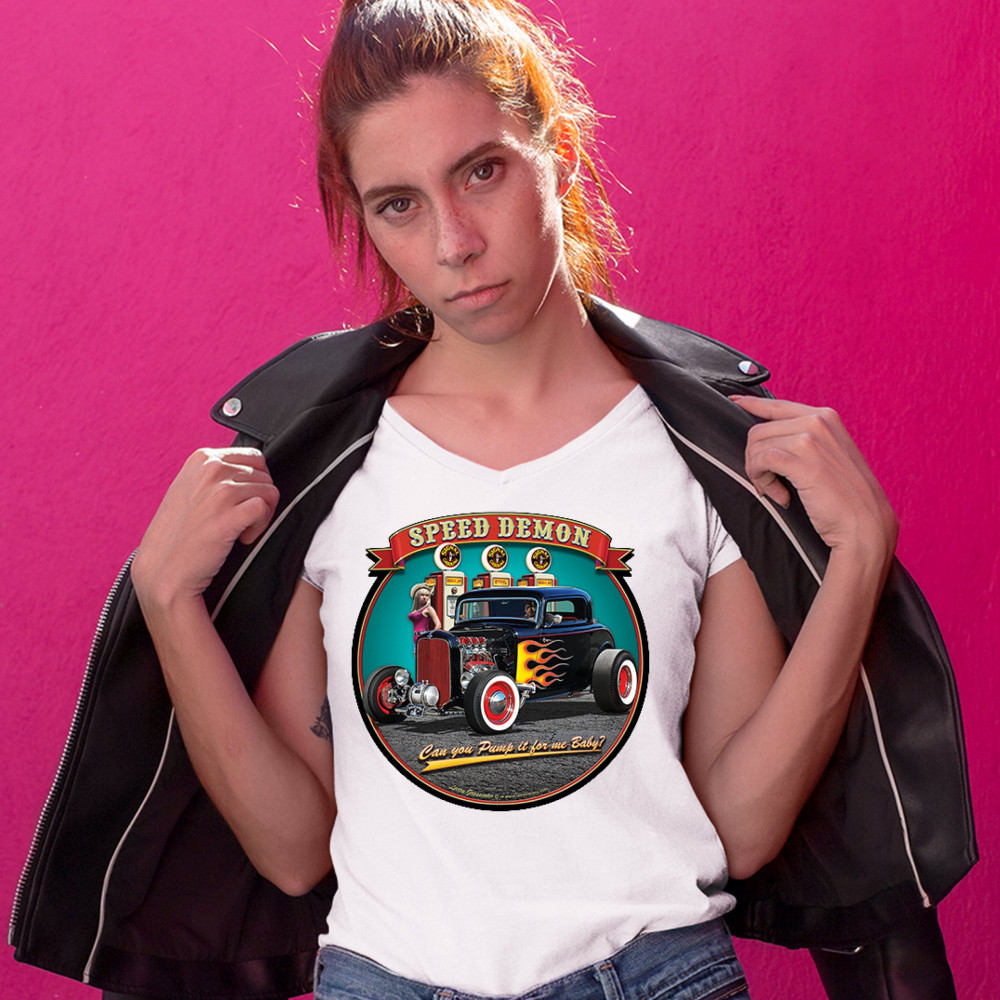 A print featuring a 1932 Ford Deuce hot rod coupe standing by a gas station. There is a cowgirl leaning on a gas pump. The print says: "speed demon" and underneath the car "Can you Pump it for me baby?". A great choice for Route 66 and hot rod fans.