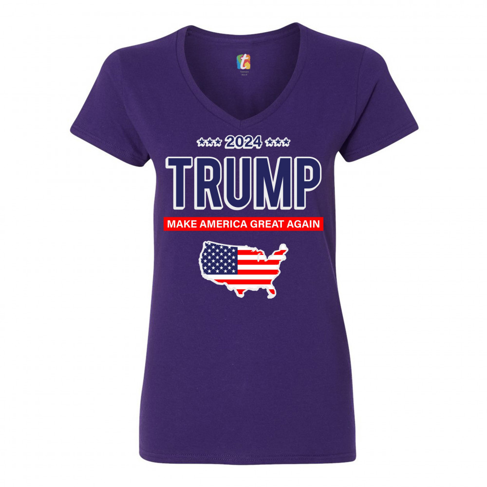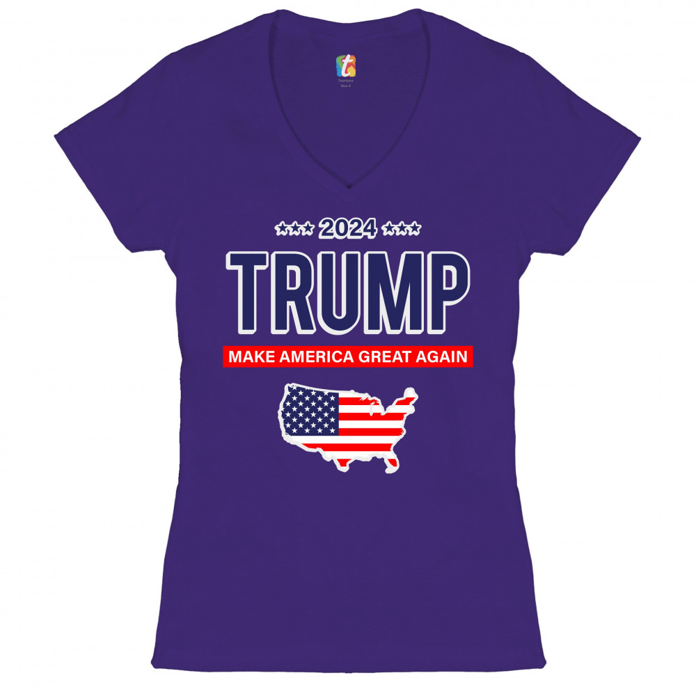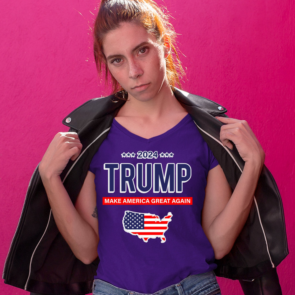 A political print saying "2024 Trump Make America Great Again" and features the silhouette of the USA with the American flag inside of it. A great choice to wear for a Trump rally or give as a gift to a Donald Trump supporter before 2024 presidential elec