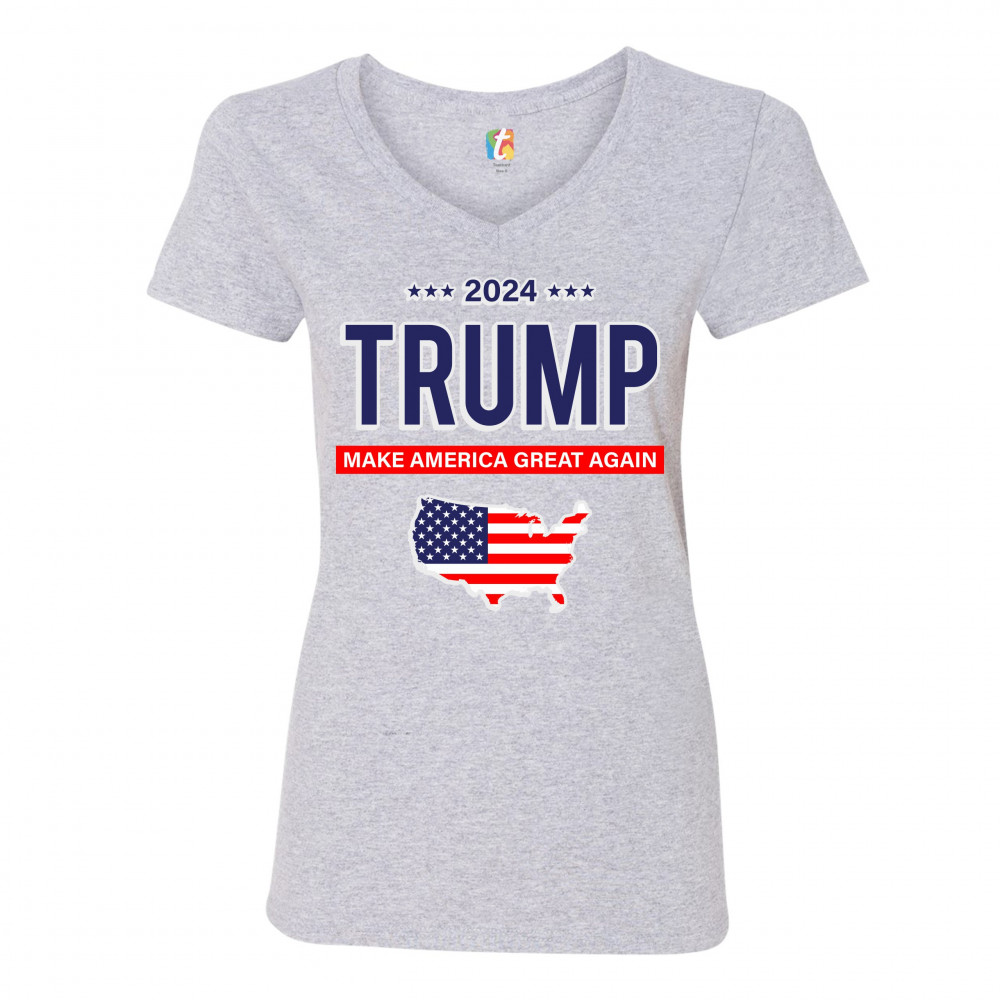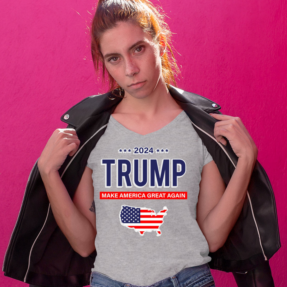 A political print saying "2024 Trump Make America Great Again" and features the silhouette of the USA with the American flag inside of it. A great choice to wear for a Trump rally or give as a gift to a Donald Trump supporter before 2024 presidential elec