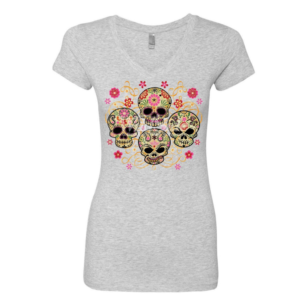 4 CUTE SUGAR SKULLS women's v-neck t-shirt calaveras dia de los muertos mexico gray