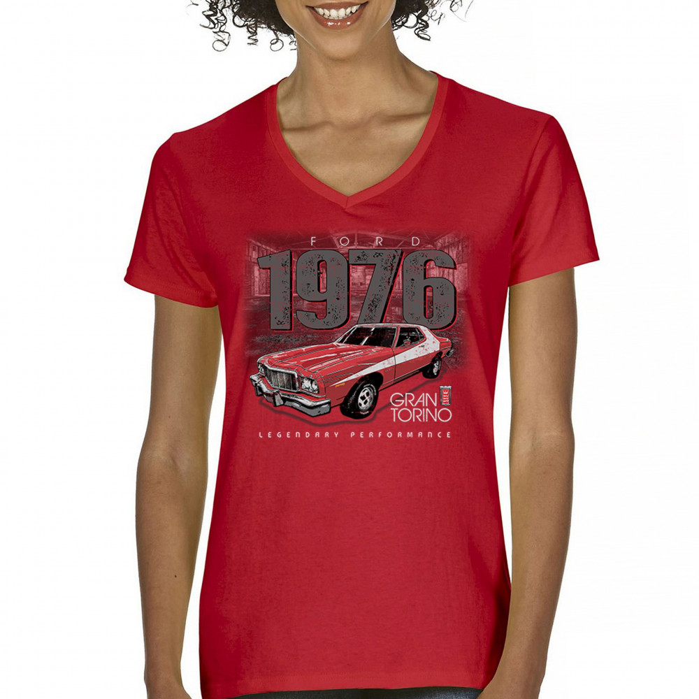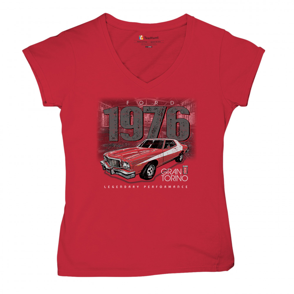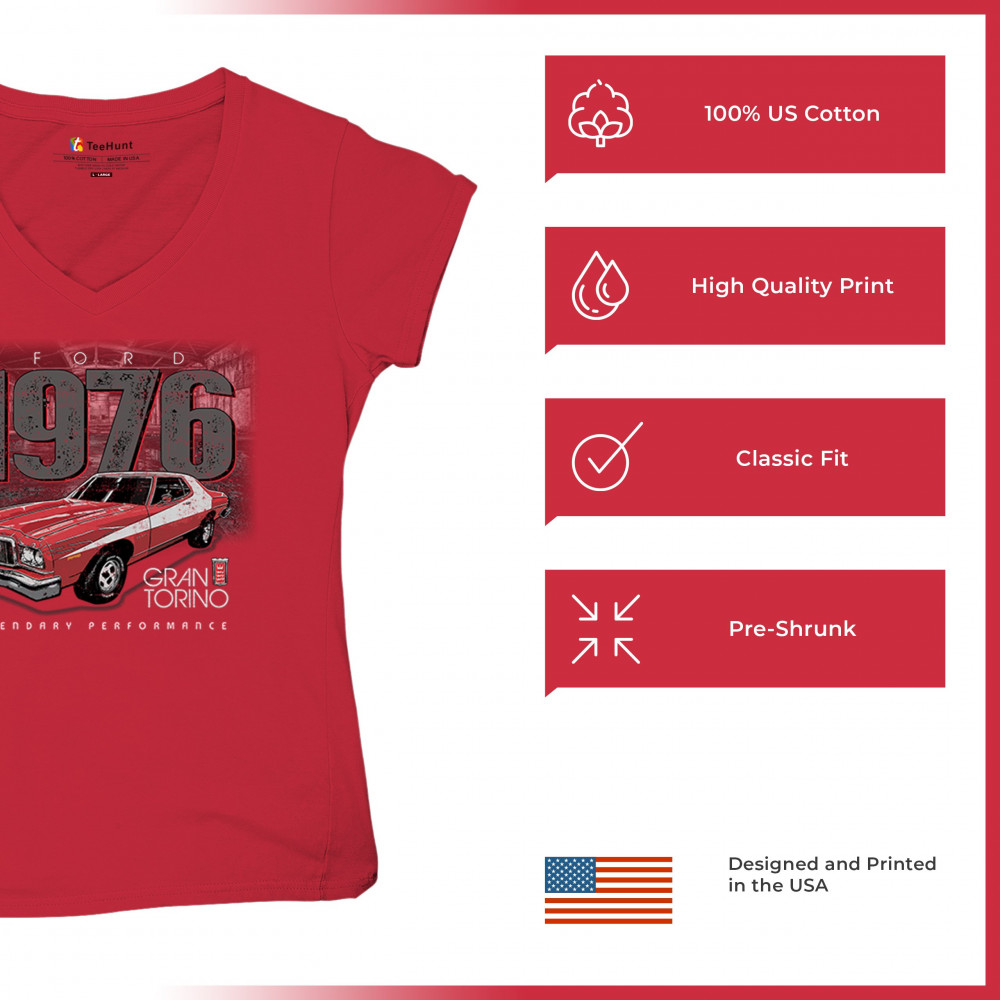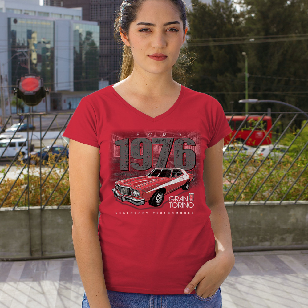 1976 Ford Gran Torino design with red and white retro style. Perfect for muscle car fans, Ford lovers, and classic car event gear.