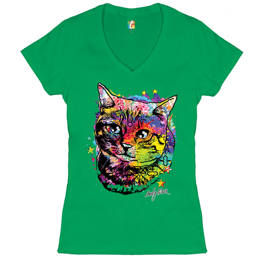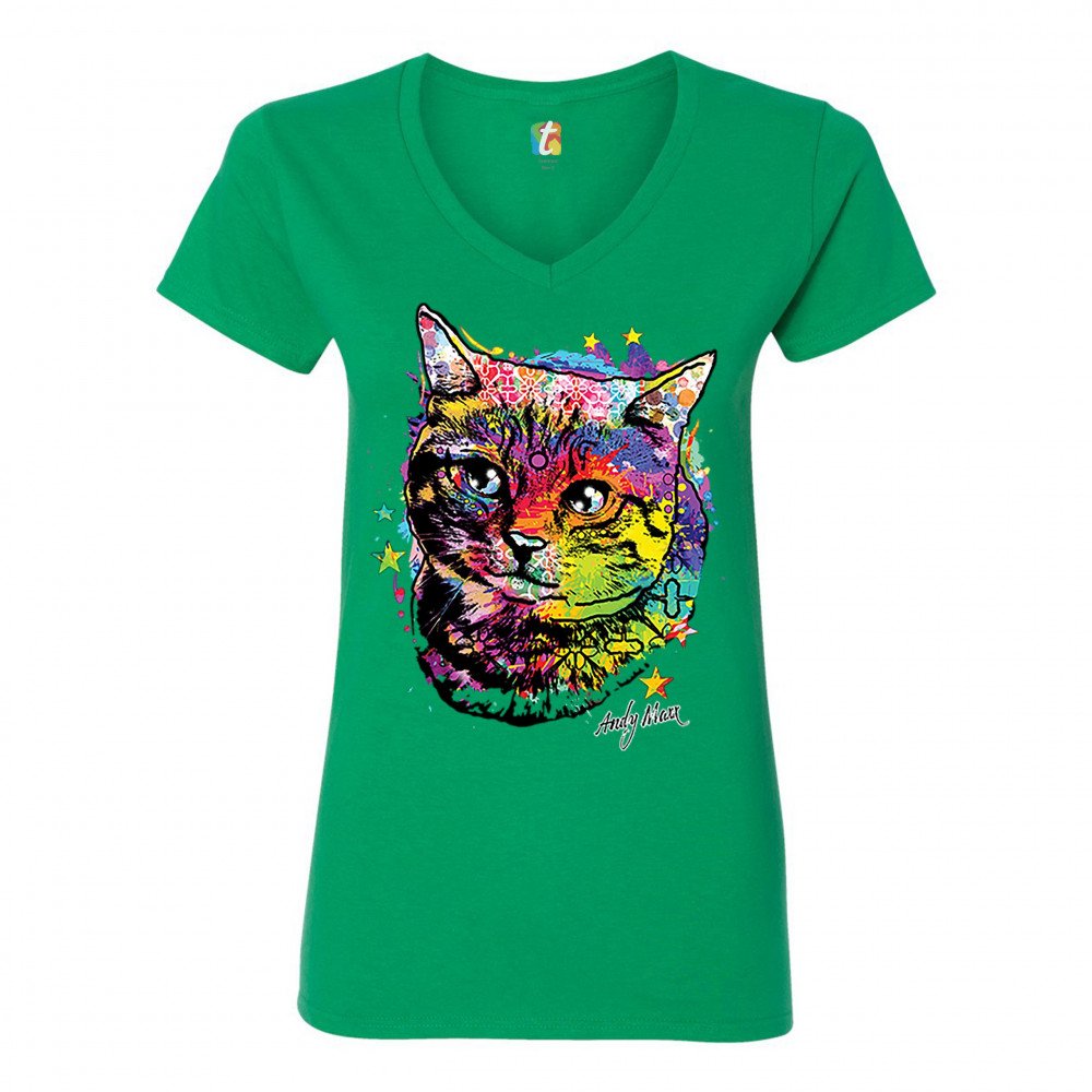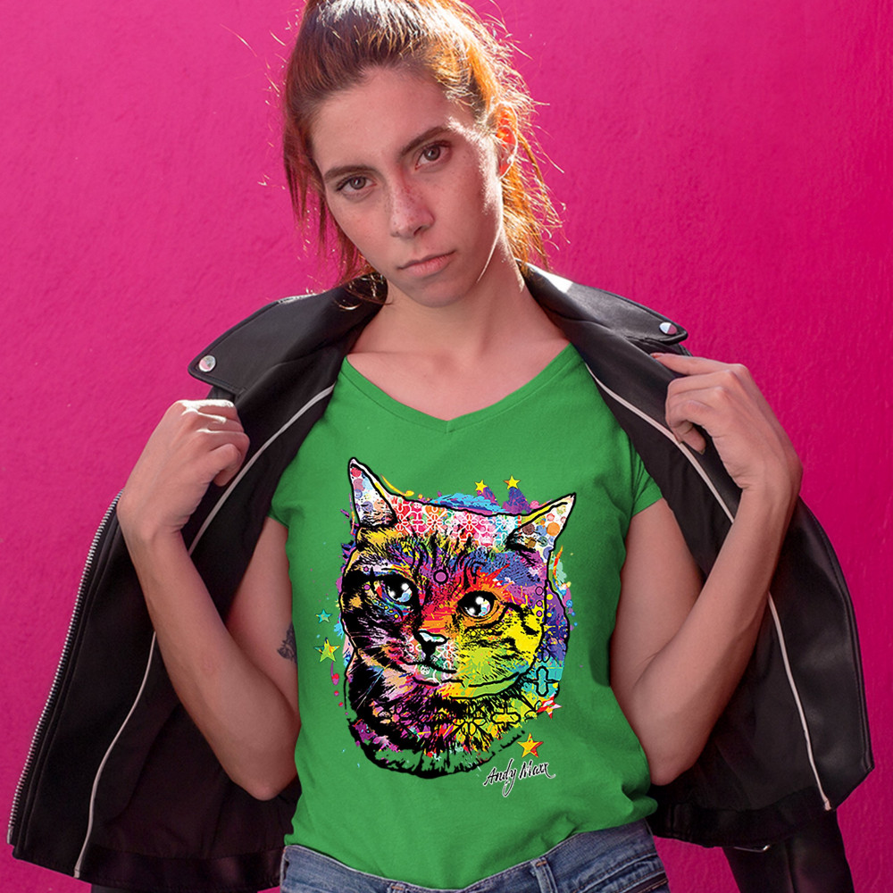 ADORABLE KITTEN women's v-neck t-shirt neon multicolor kitty andy maxx cat tee green