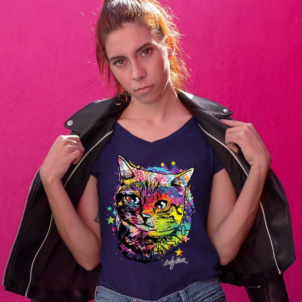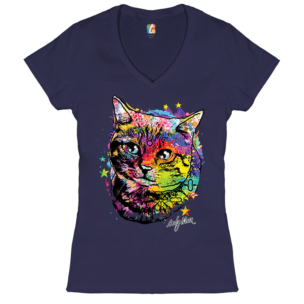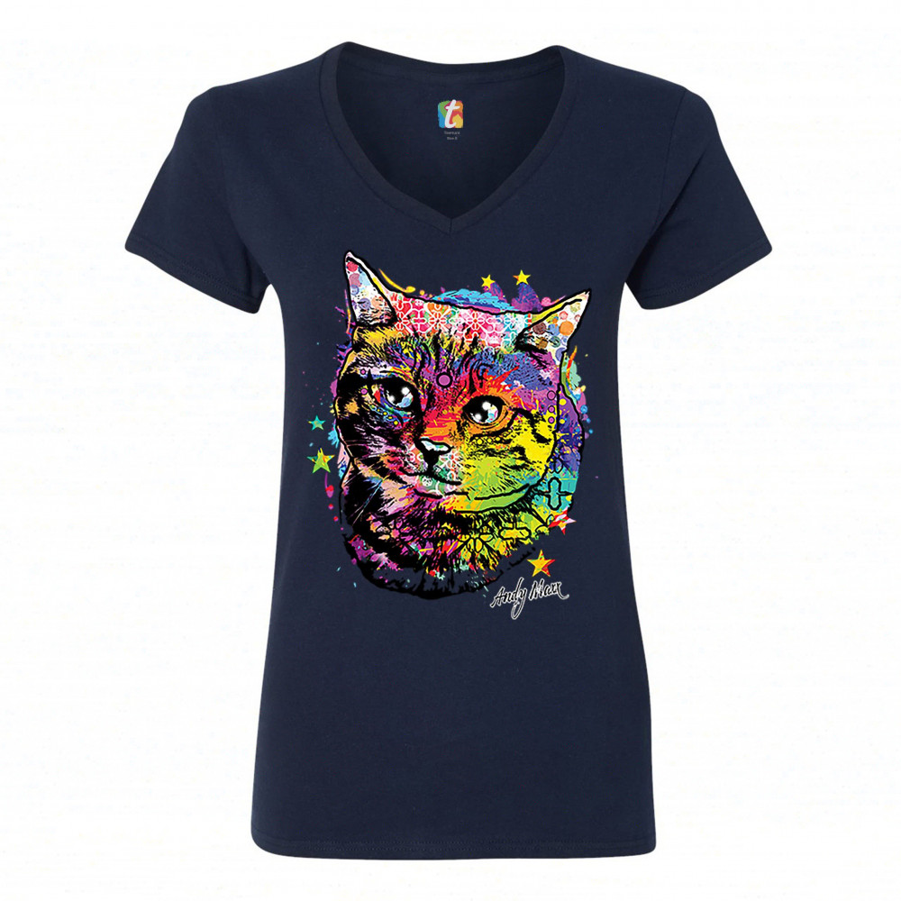 ADORABLE KITTEN women's v-neck t-shirt neon multicolor kitty andy maxx cat tee navy blue