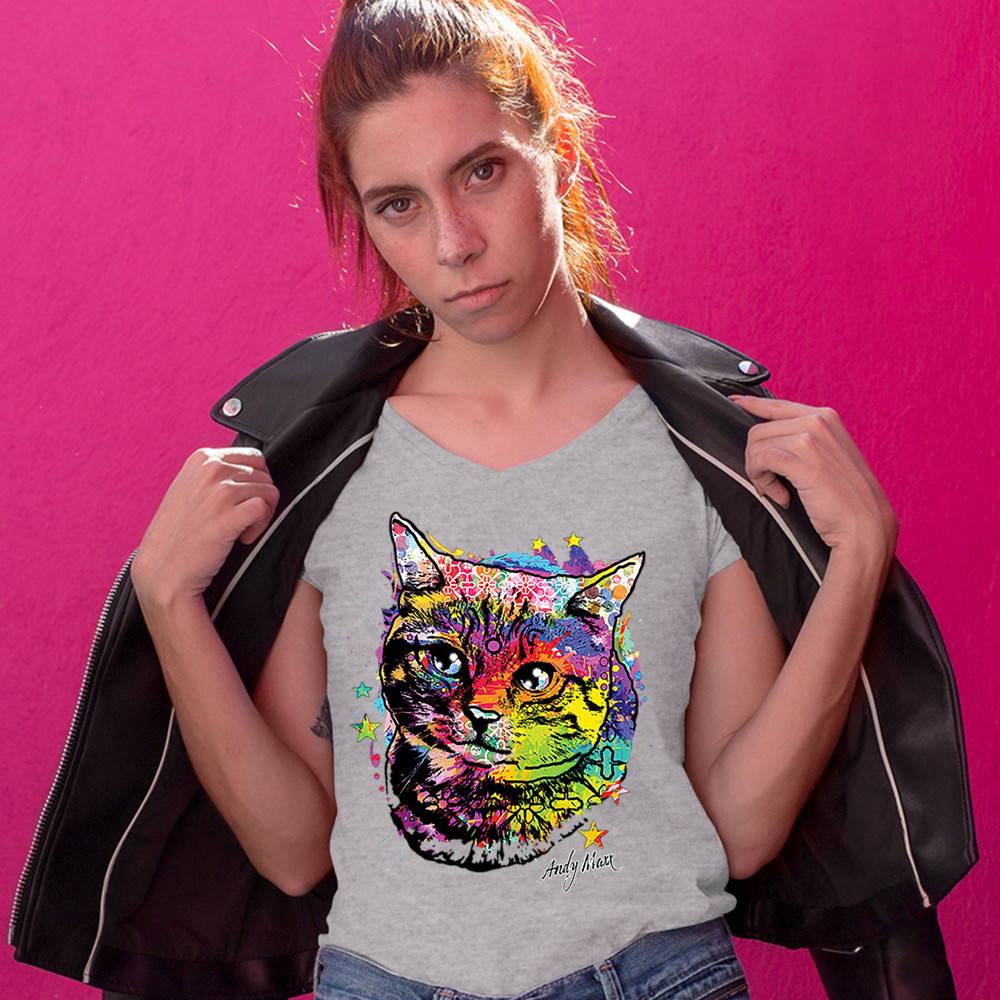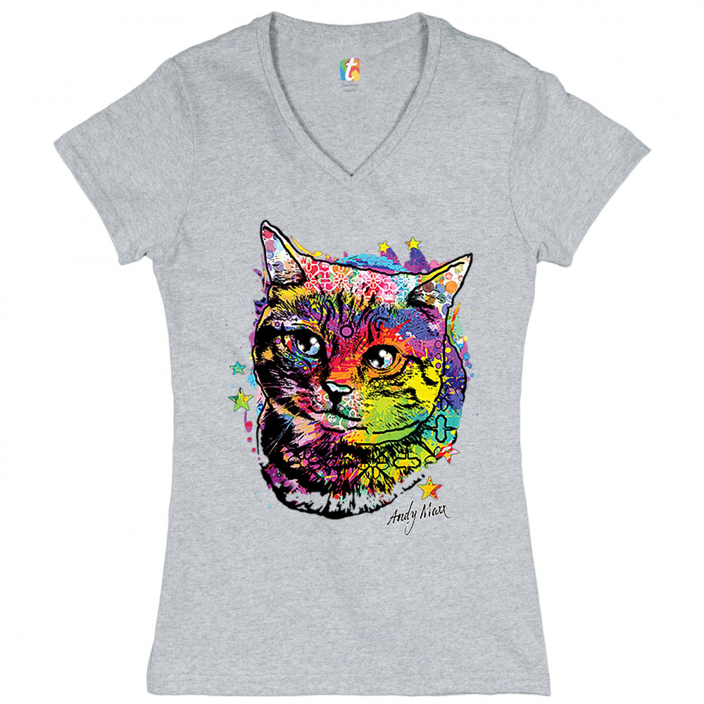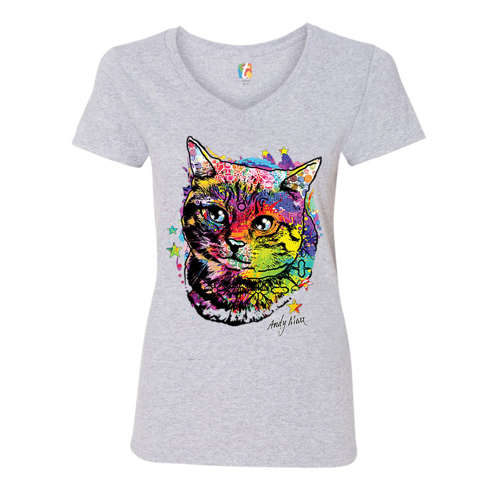 ADORABLE KITTEN women's v-neck t-shirt neon multicolor kitty andy maxx cat tee gray