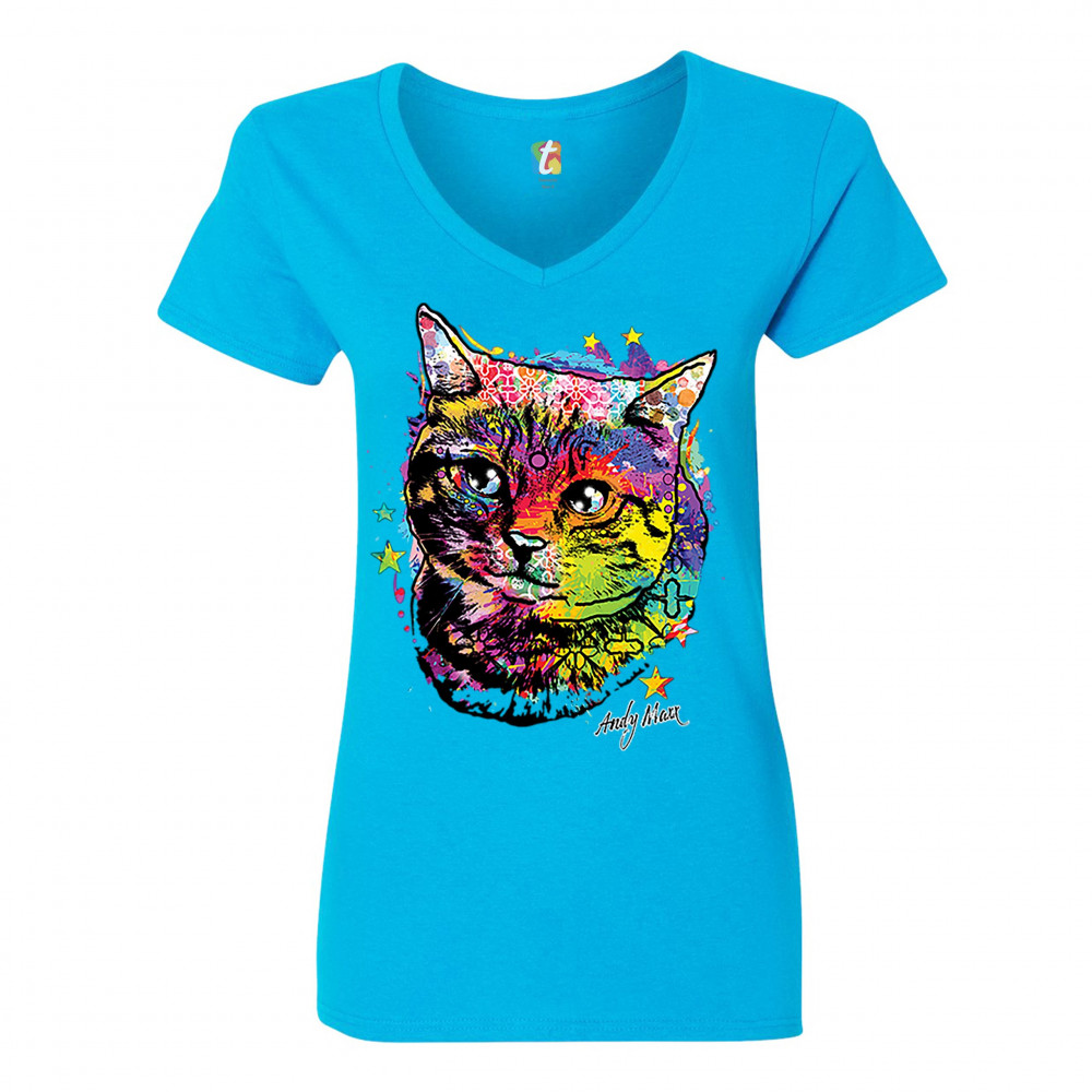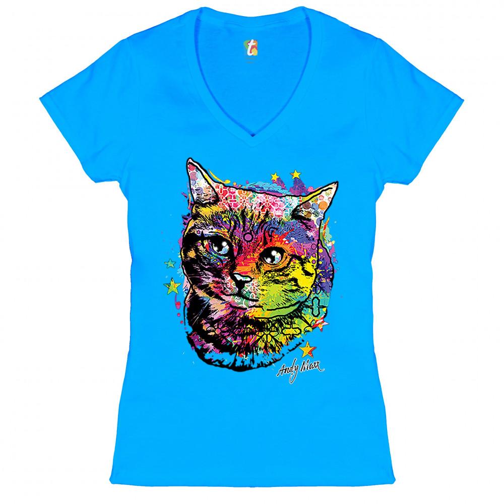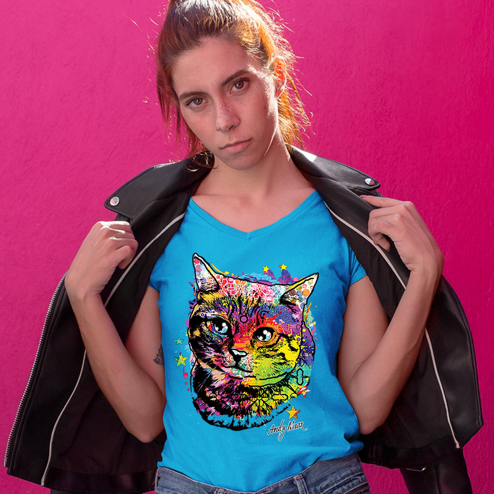 ADORABLE KITTEN women's v-neck t-shirt neon multicolor kitty andy maxx cat tee turquoise