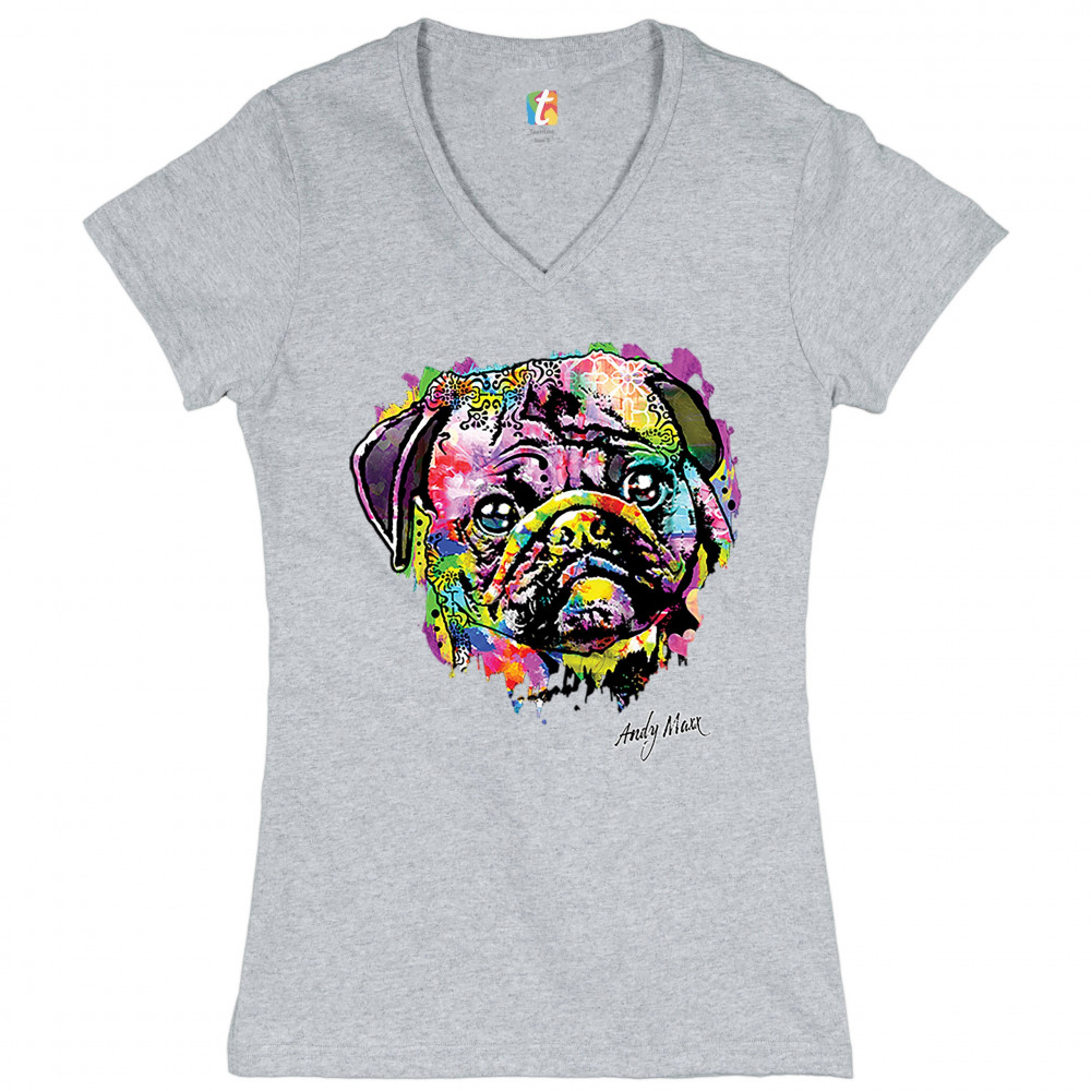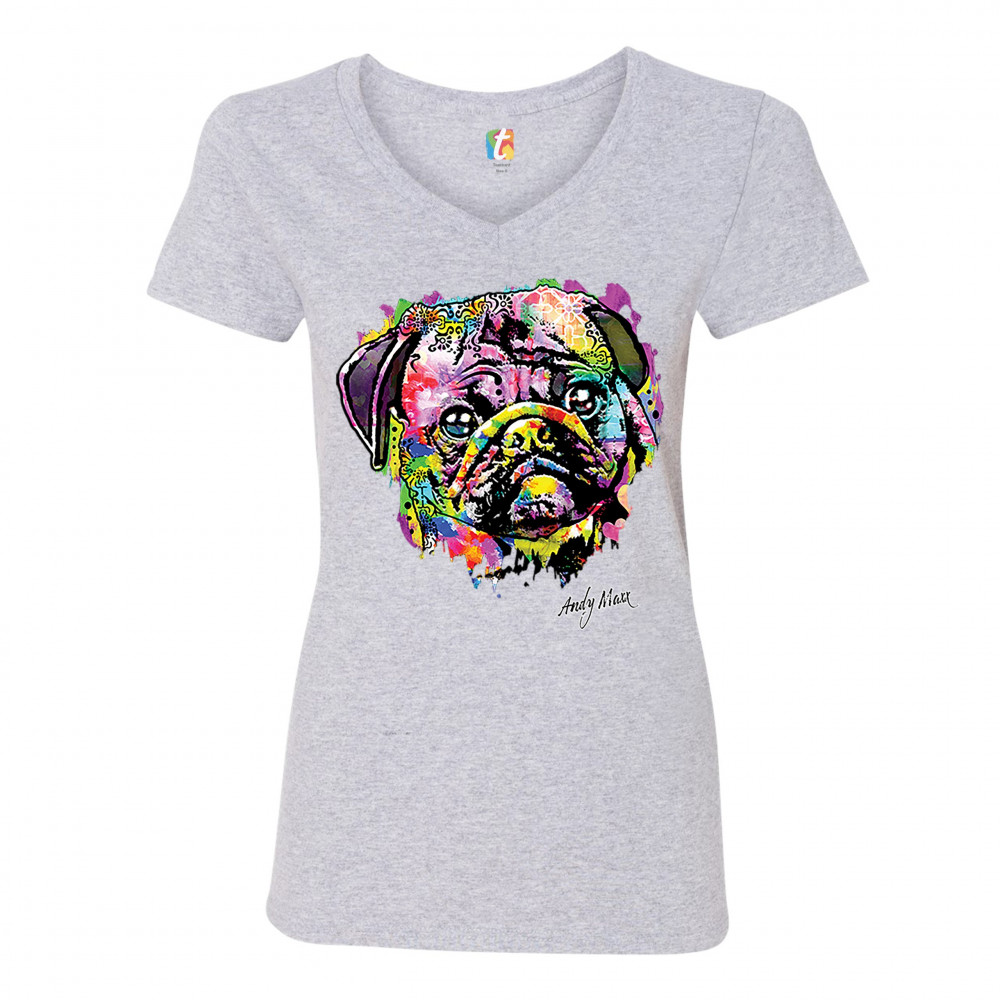 ADORABLE PUG women's v-neck t-shirt andy maxx pet owner i love my dog tee gray