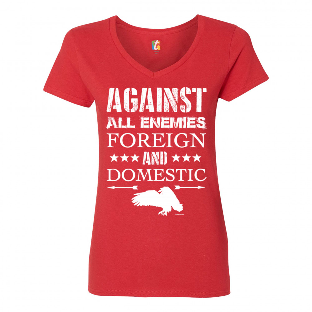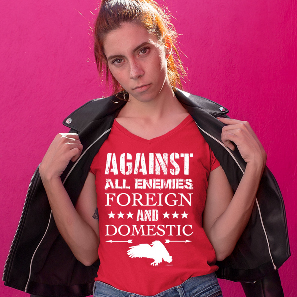 AGAINST ALL ENEMIES FOREIGN AND DOMESTIC women's v-neck t-shirt veteran tee red