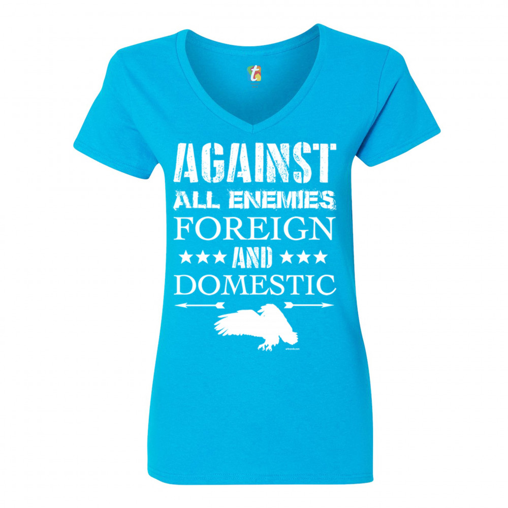 AGAINST ALL ENEMIES FOREIGN AND DOMESTIC women's v-neck t-shirt veteran tee turquoise