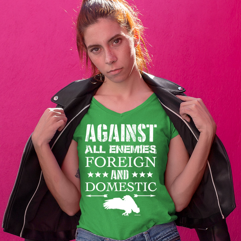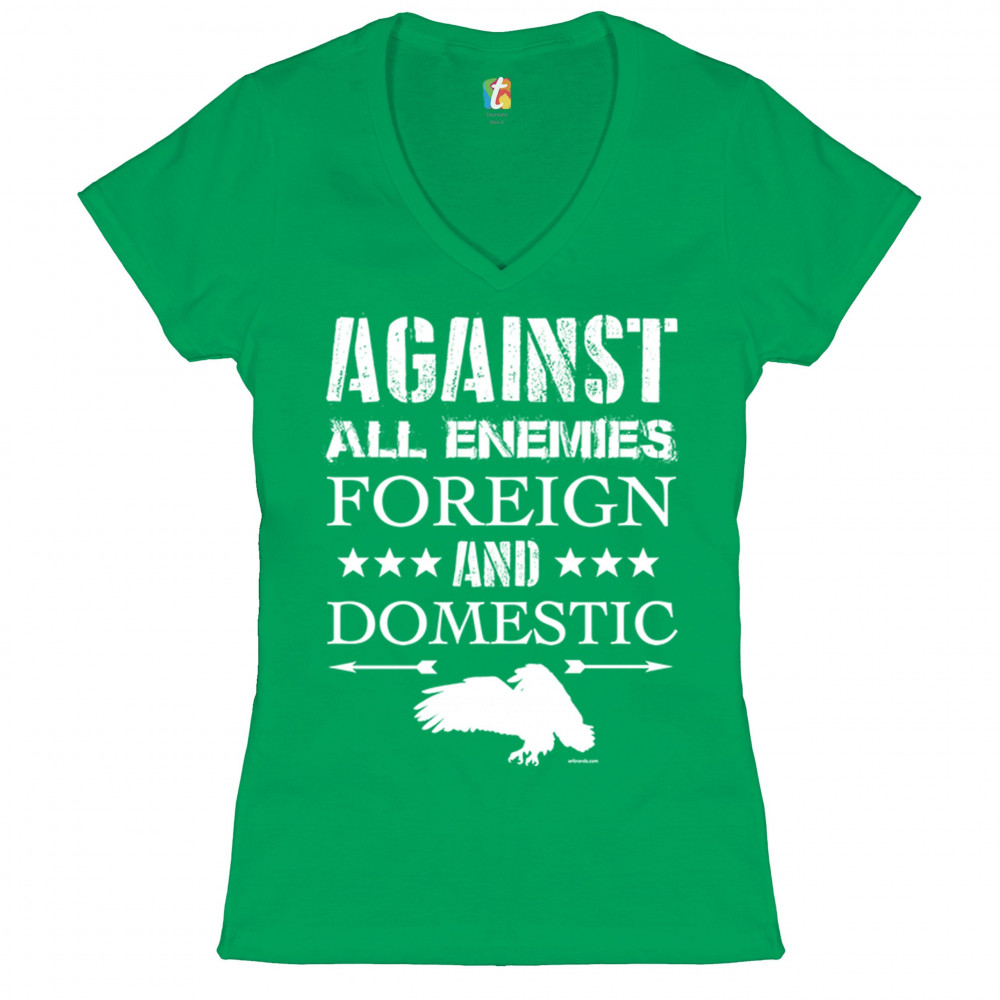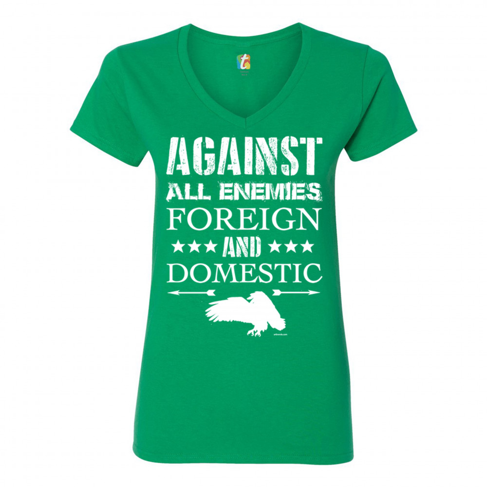 AGAINST ALL ENEMIES FOREIGN AND DOMESTIC women's v-neck t-shirt veteran tee green