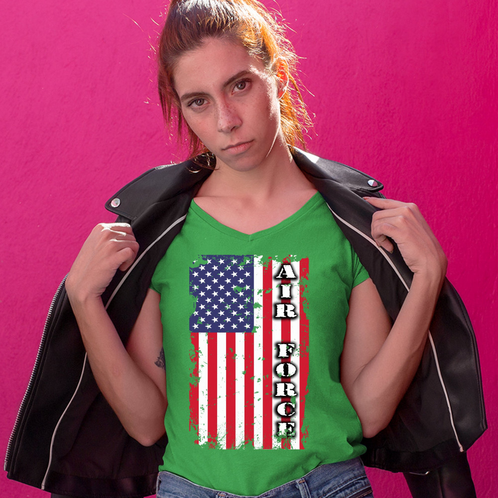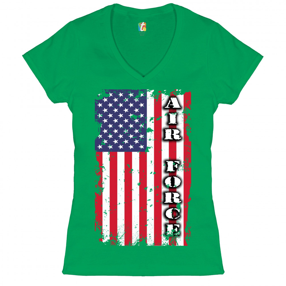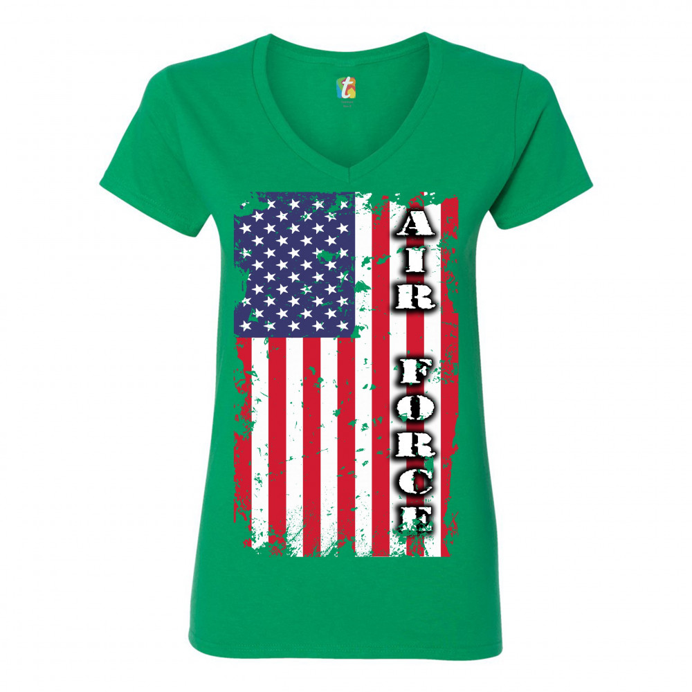 AIR FORCE women's v-neck t-shirt distressed american flag us armed forces tee green