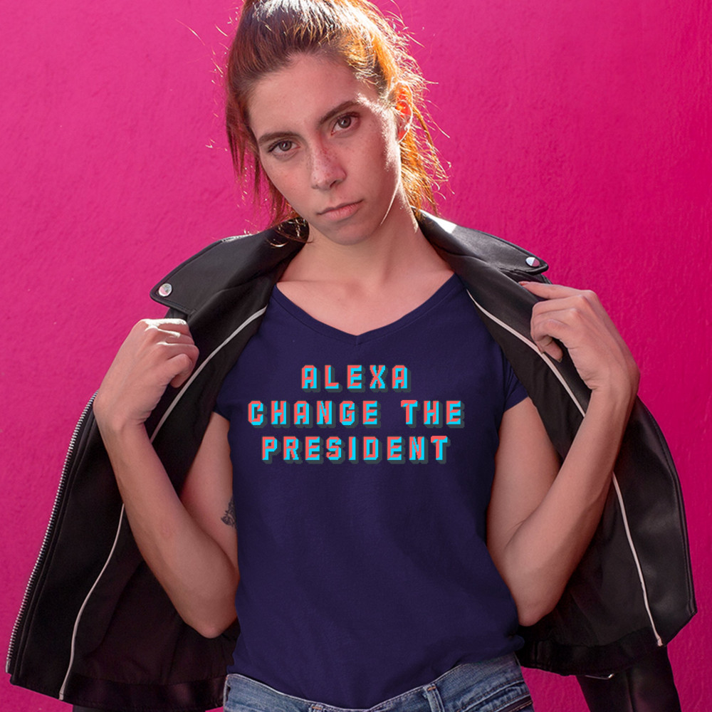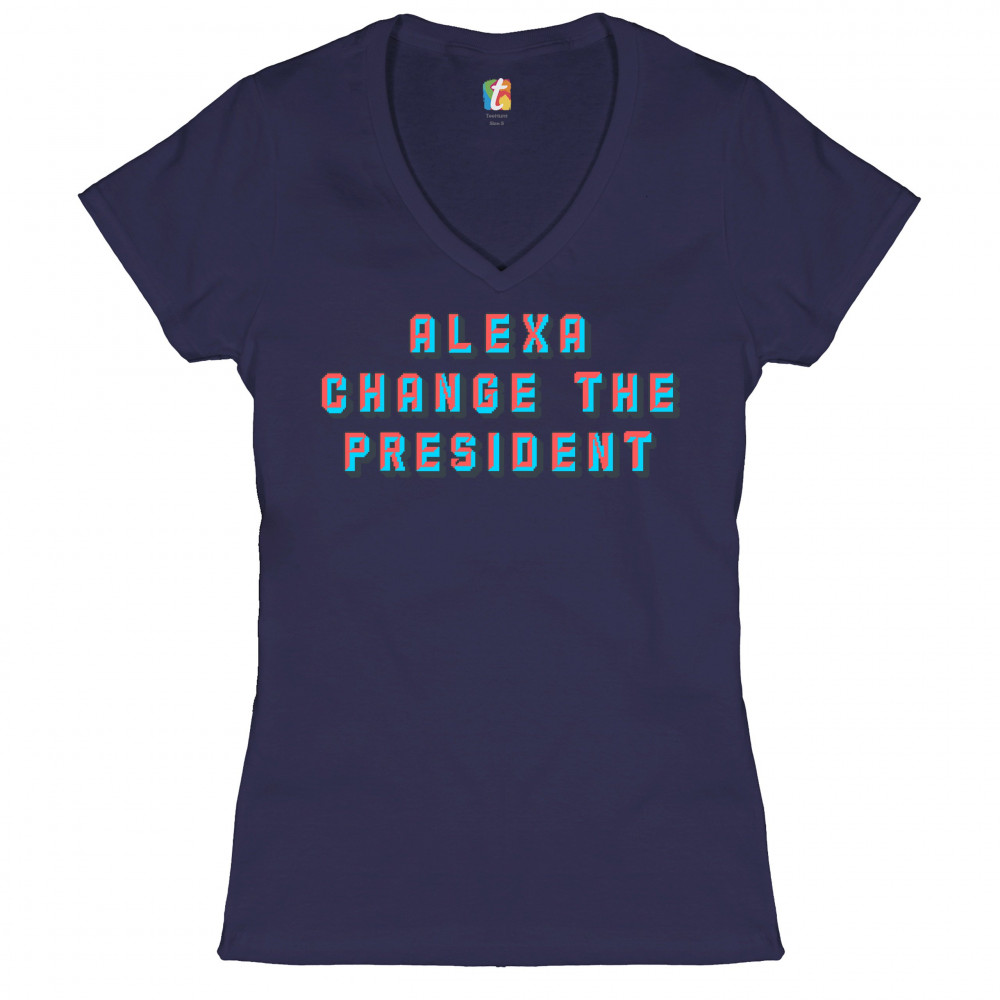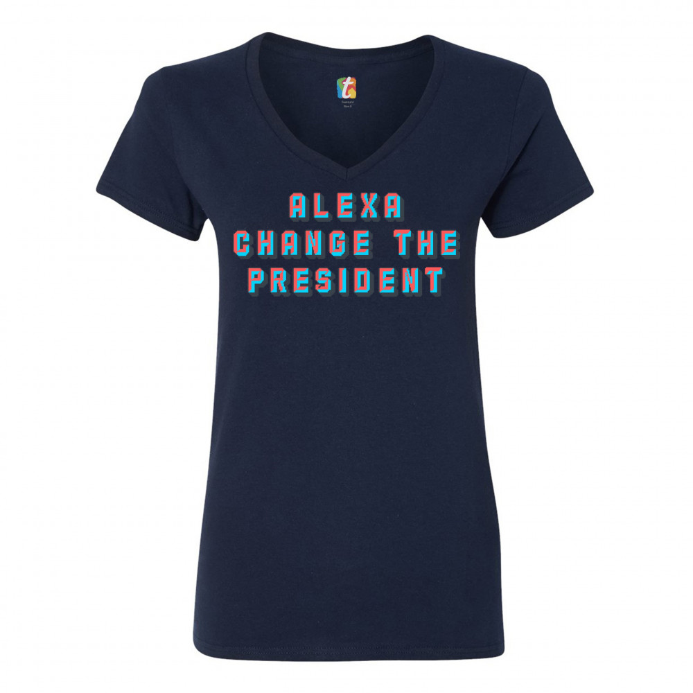 ALEXA CHANGE THE PRESIDENT women's v-neck t-shirt donald trump 2024 maga tee navy blue