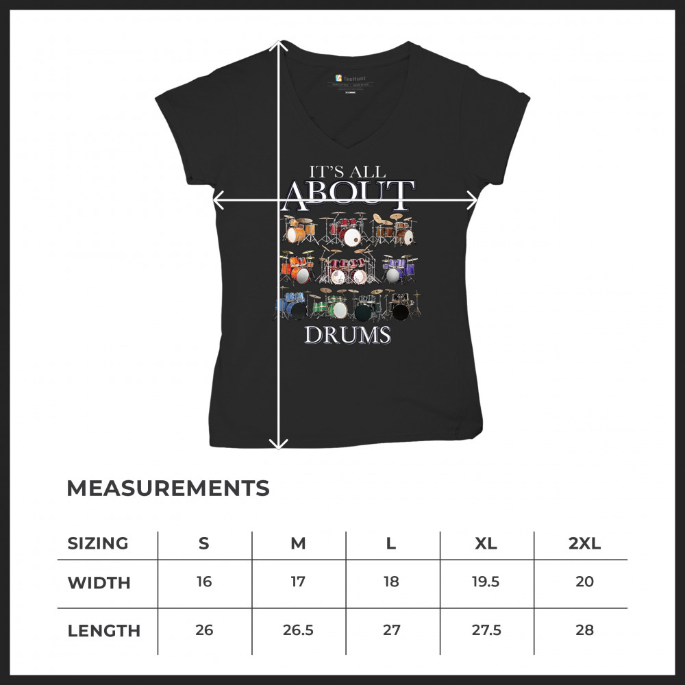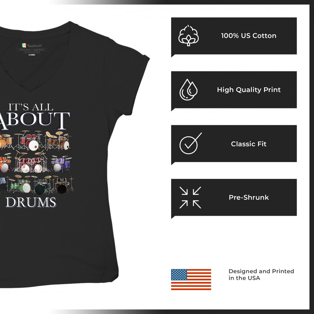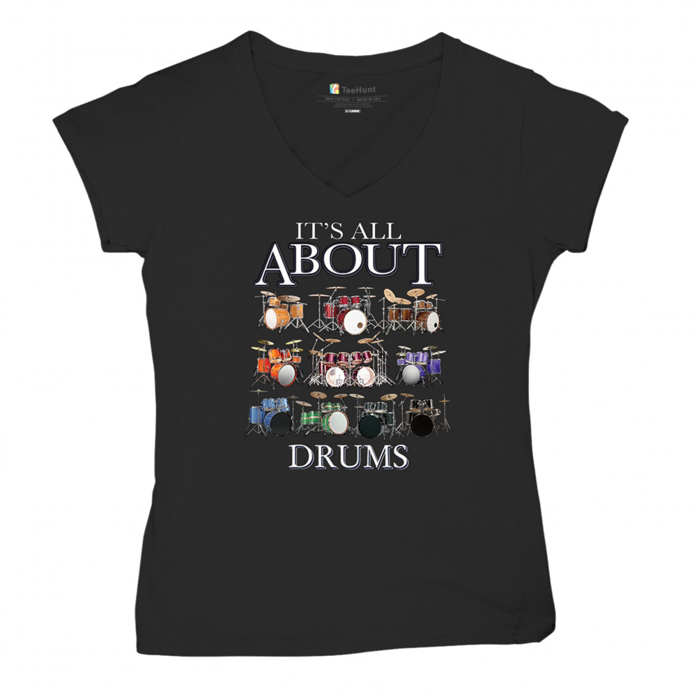 ALL ABOUT DRUMS women's v-neck t-shirt colorful funny music festival party tee black