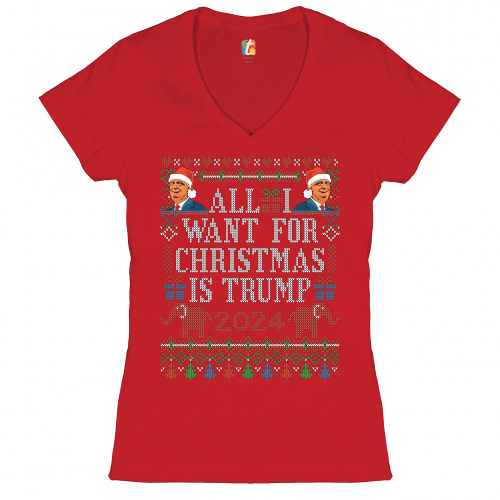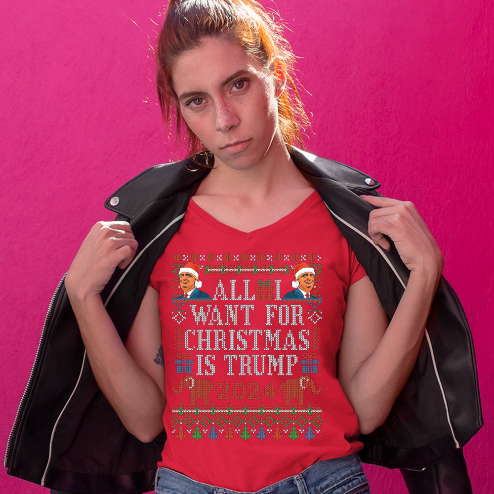 A funny print saying: "All I Want for Christmas Is Trump 2024". The print is decorated as a Christmas ugly sweater and features faces of Donald Trump wearing Christmas hats and two elephants. A great choice to wear for a Christmas or New Year's Eve party