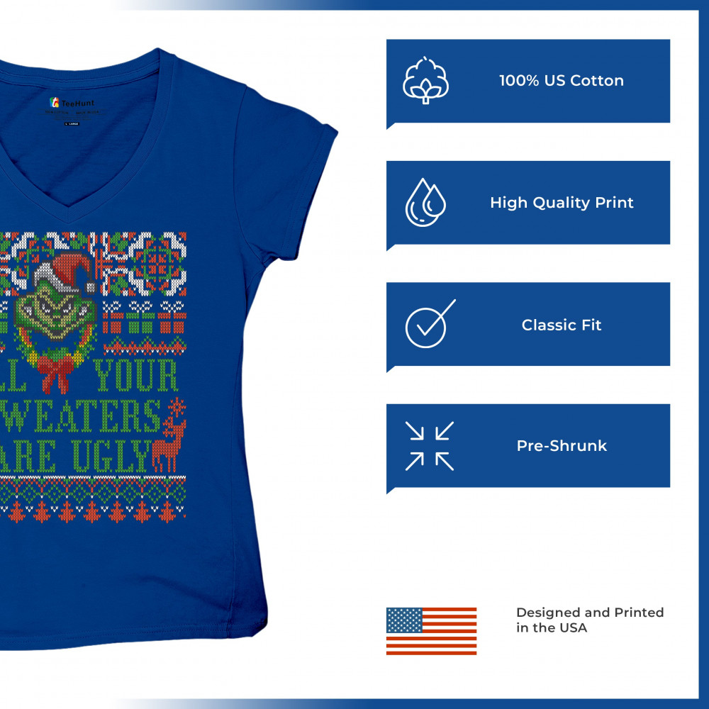A funny print saying: "All Your Sweaters Are Ugly" and featuring a green goblin's face and two reindeers. The print is decorated as an ugly sweater. Amazing choice to make people smile and spread positive vibes on Christmas Eve.