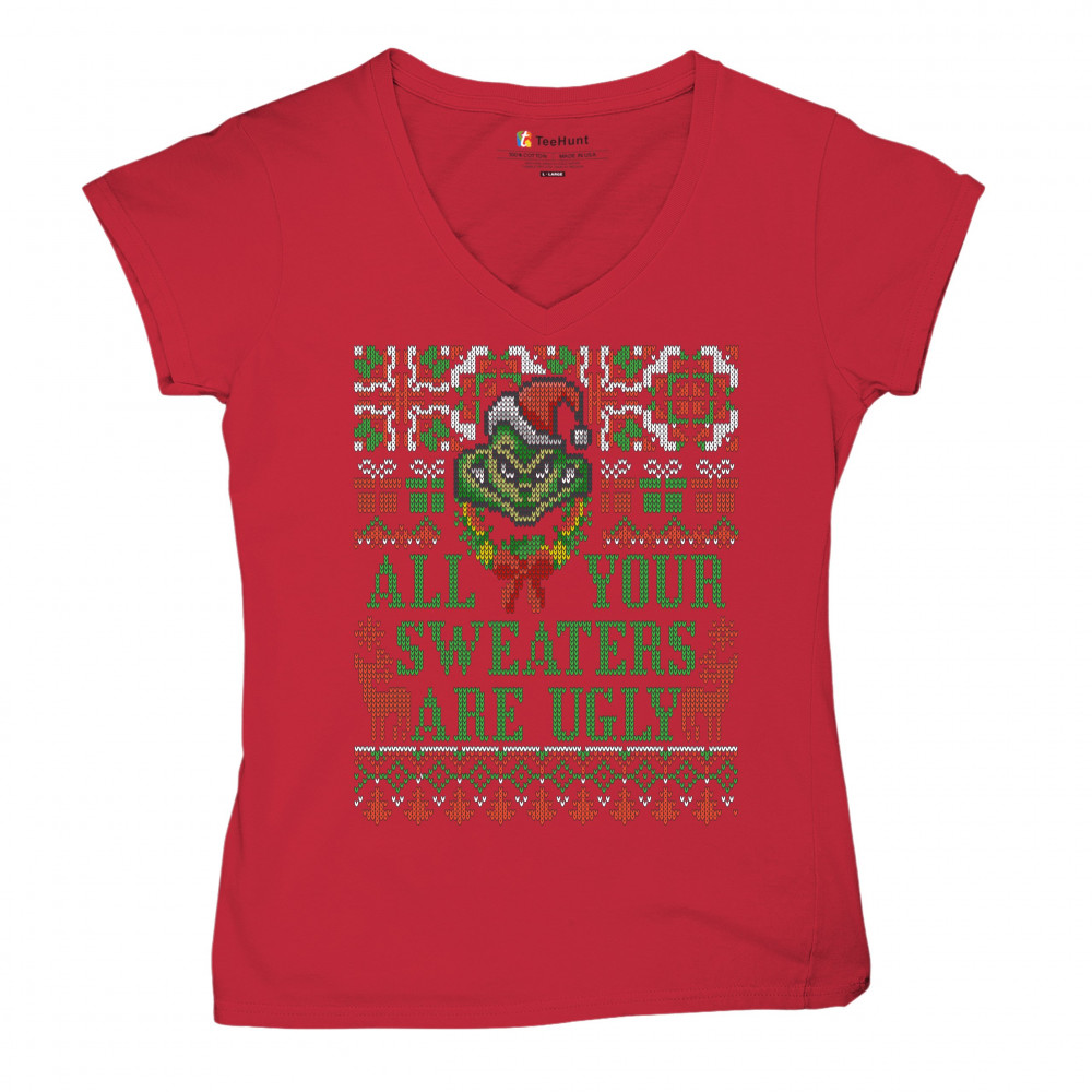 ALL YOUR SWEATERS ARE UGLY women's v-neck t-shirt merry christmas rudolph tee red