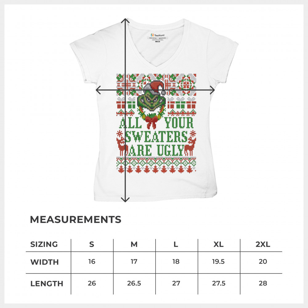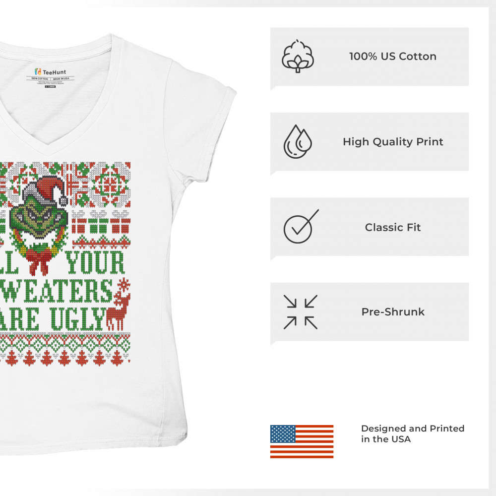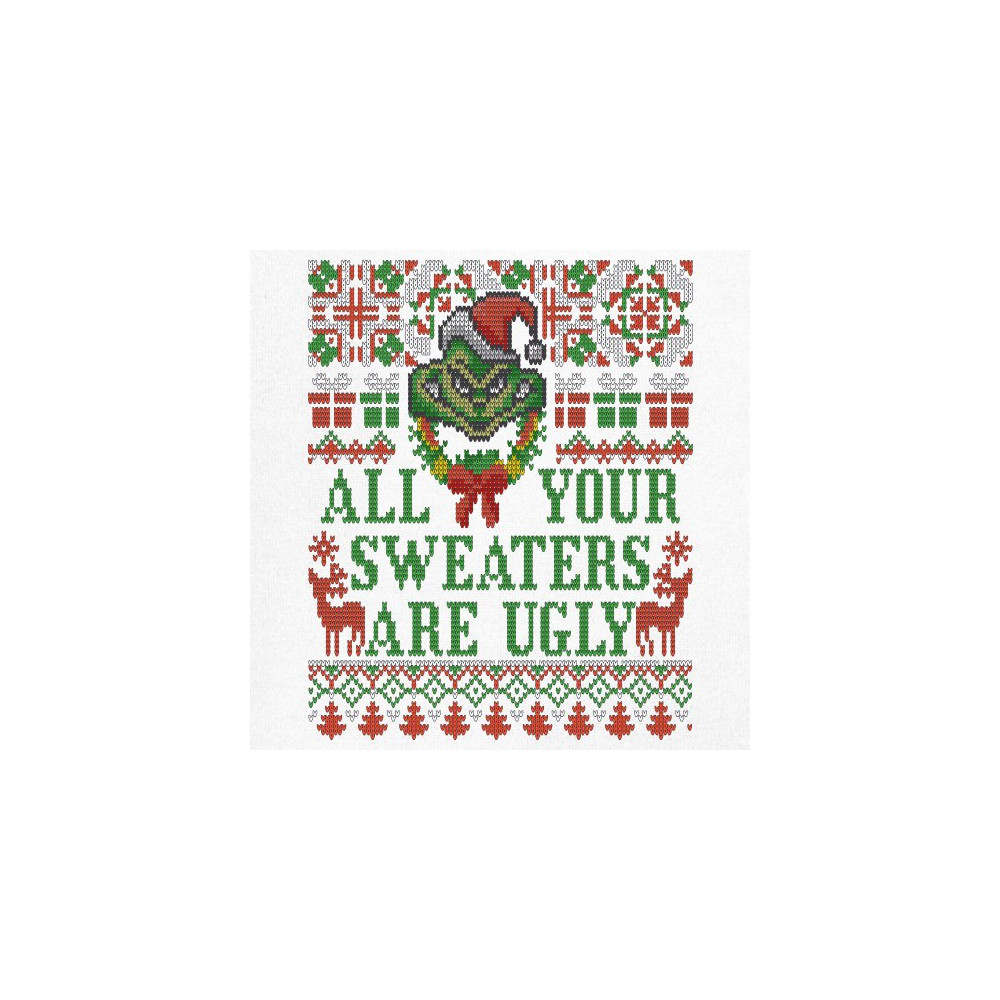 A funny print saying: "All Your Sweaters Are Ugly" and featuring a green goblin's face and two reindeers. The print is decorated as an ugly sweater. Amazing choice to make people smile and spread positive vibes on Christmas Eve.