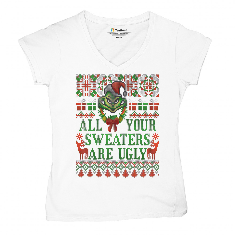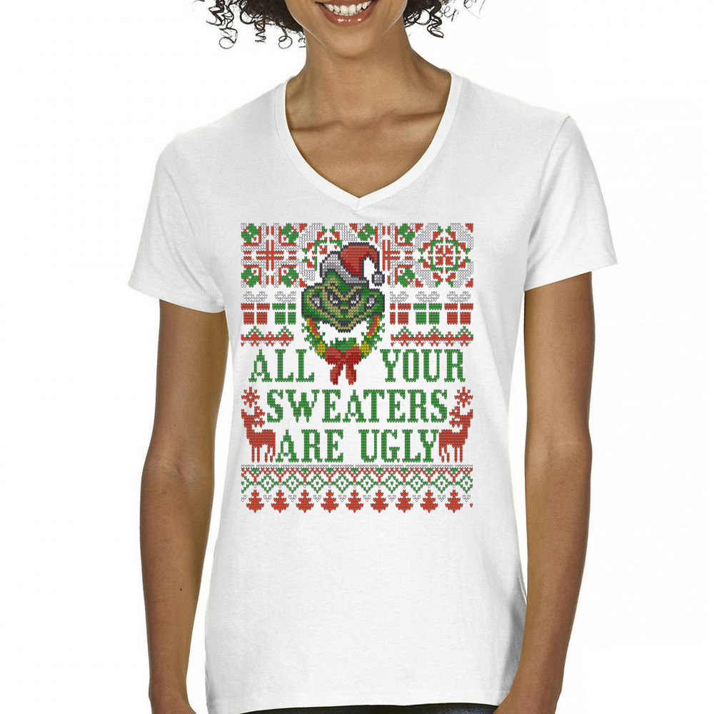 ALL YOUR SWEATERS ARE UGLY women's v-neck t-shirt merry christmas rudolph tee white