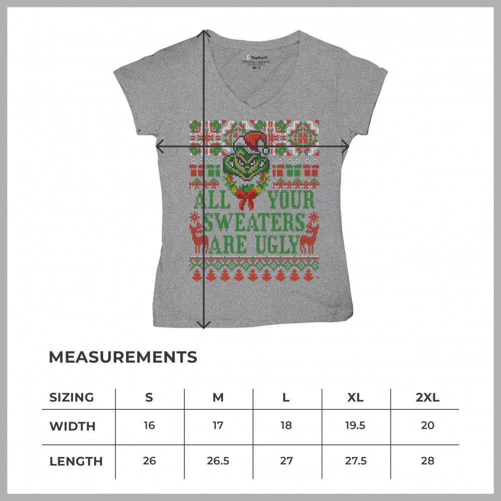 A funny print saying: "All Your Sweaters Are Ugly" and featuring a green goblin's face and two reindeers. The print is decorated as an ugly sweater. Amazing choice to make people smile and spread positive vibes on Christmas Eve.
