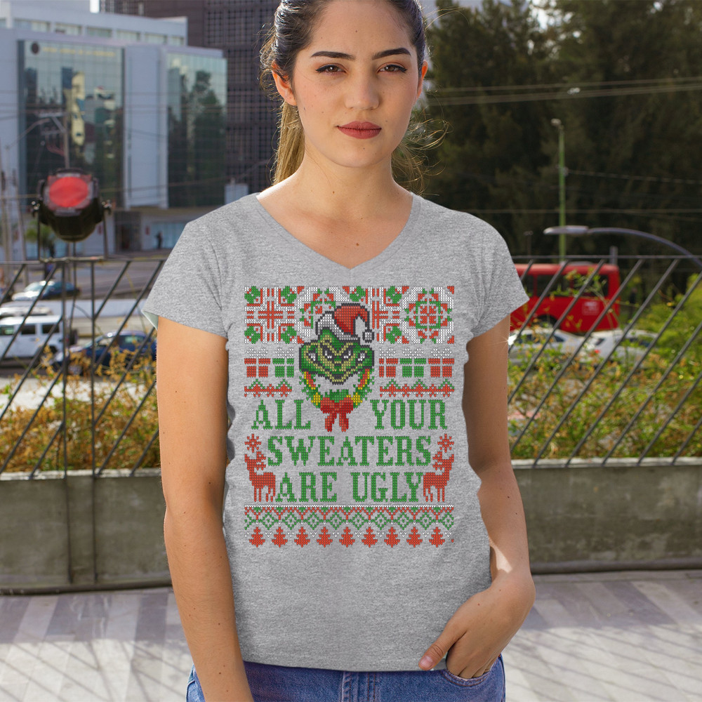 ALL YOUR SWEATERS ARE UGLY women's v-neck t-shirt merry christmas rudolph tee gray