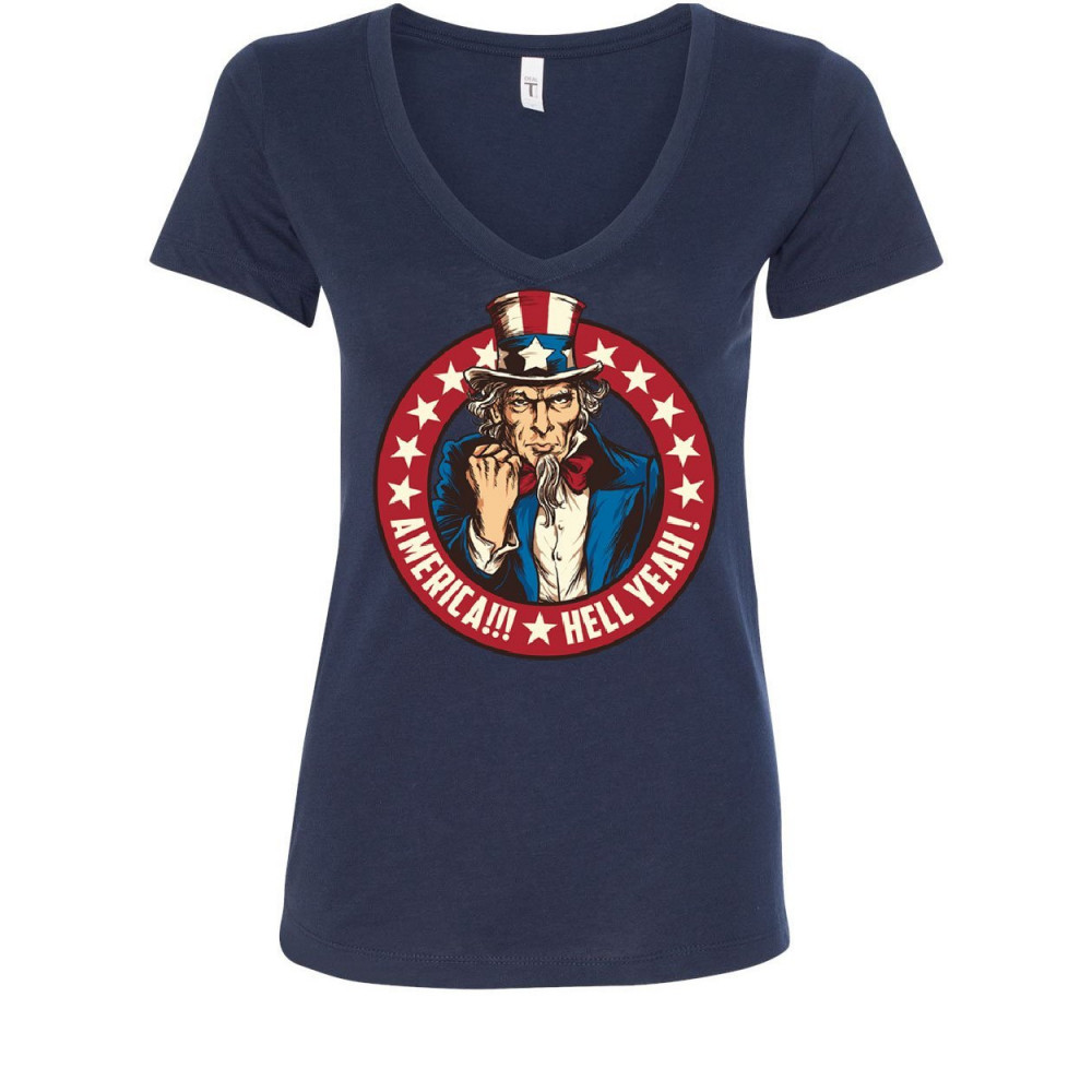 AMERICA HELL YEAH women's v-neck t-shirt uncle sam patriotic stars and stripes navy blue