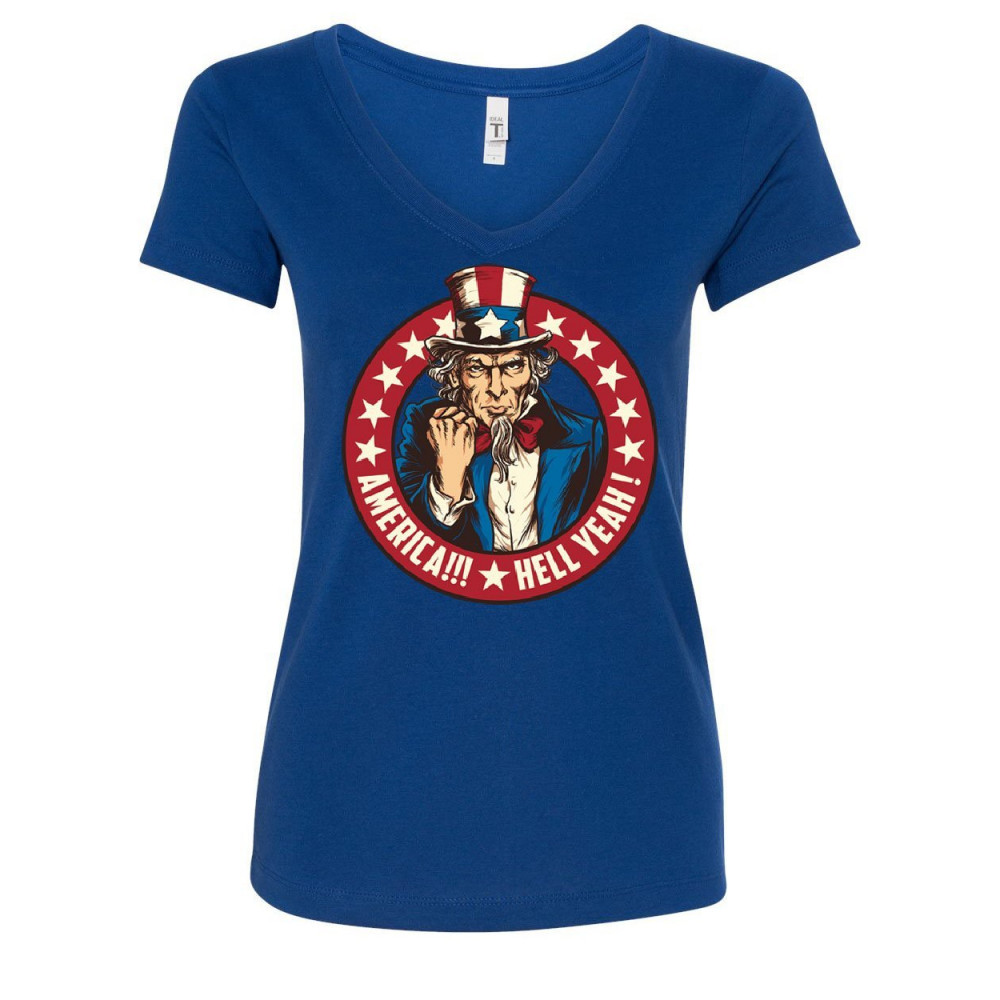 AMERICA HELL YEAH women's v-neck t-shirt uncle sam patriotic stars and stripes royal blue