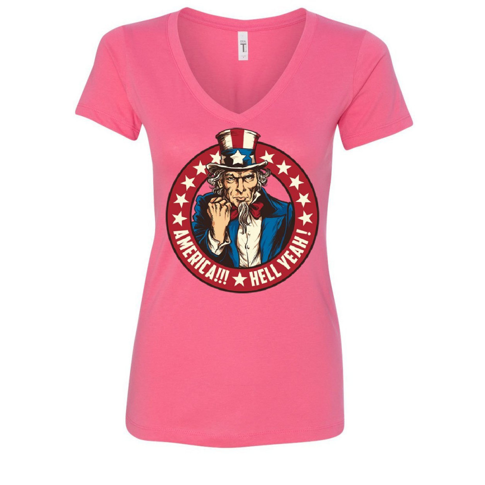 AMERICA HELL YEAH women's v-neck t-shirt uncle sam patriotic stars and stripes pink
