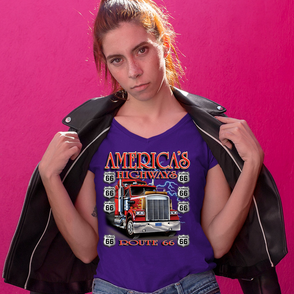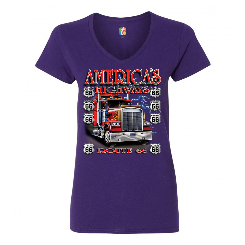 AMERICA'S HIGHWAYS ROUTE 66 women's v-neck t-shirt truck driver mechanic tee purple