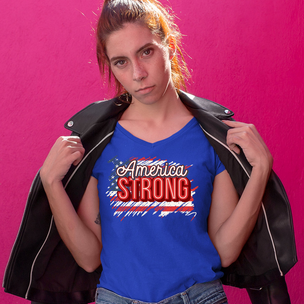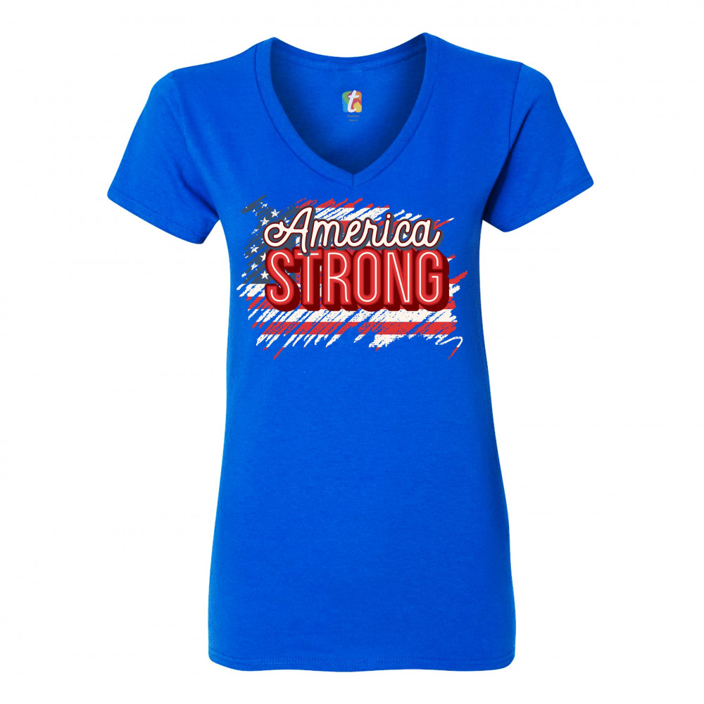 AMERICA STRONG women's v-neck t-shirt distressed american flag 4th of july tee royal blue