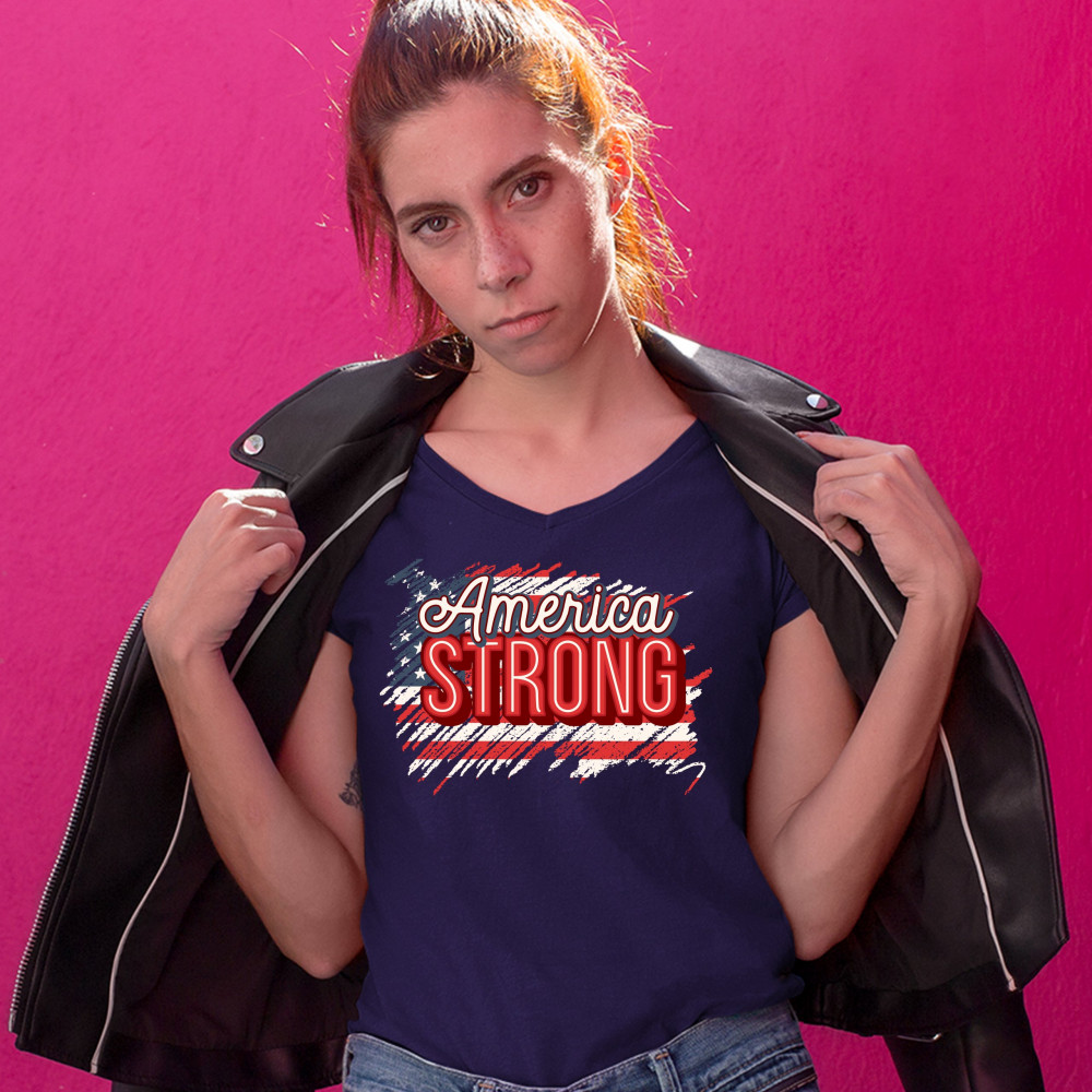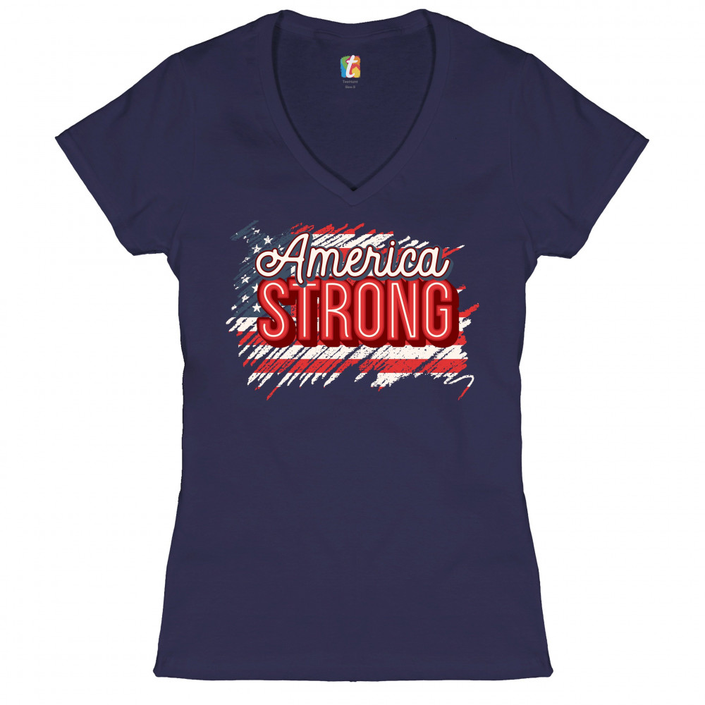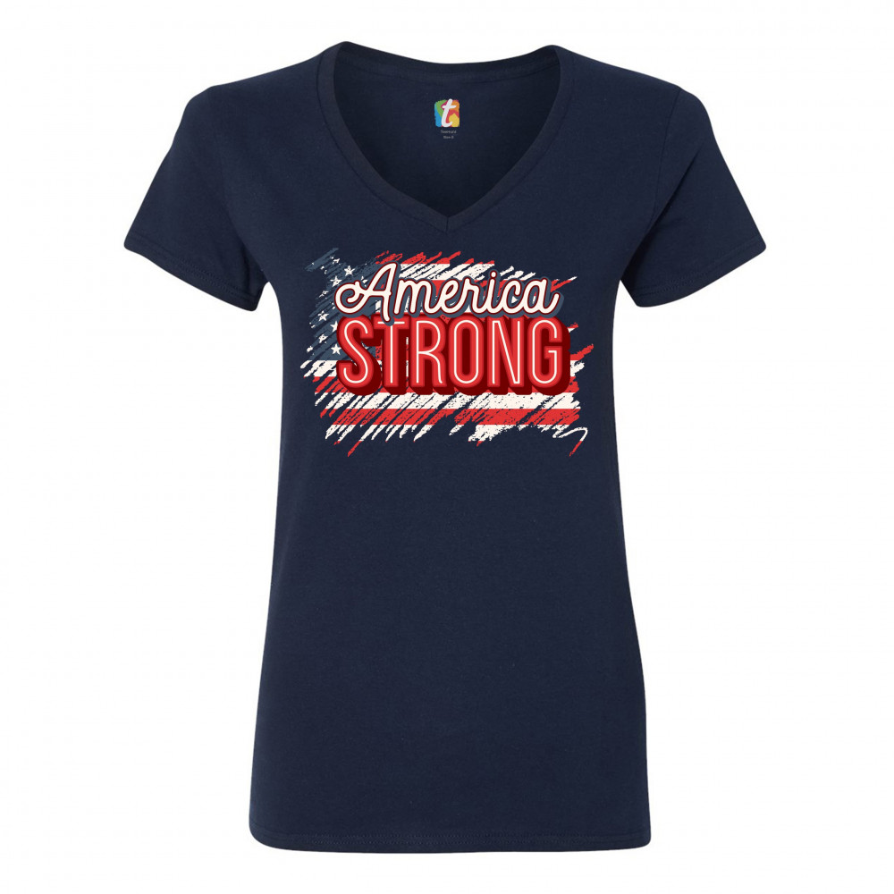 AMERICA STRONG women's v-neck t-shirt distressed american flag 4th of july tee navy blue