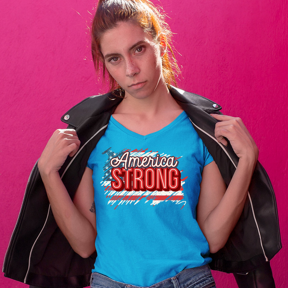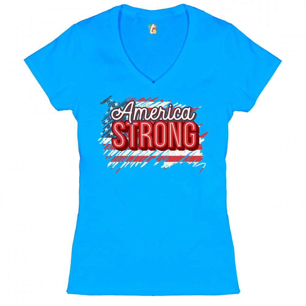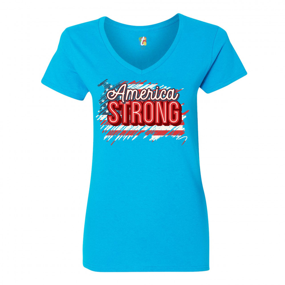 AMERICA STRONG women's v-neck t-shirt distressed american flag 4th of july tee turquoise