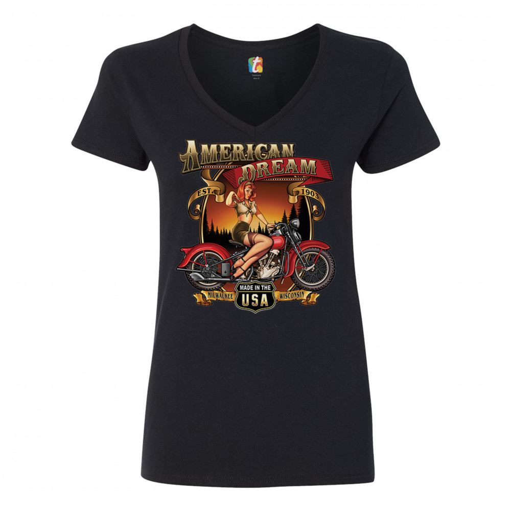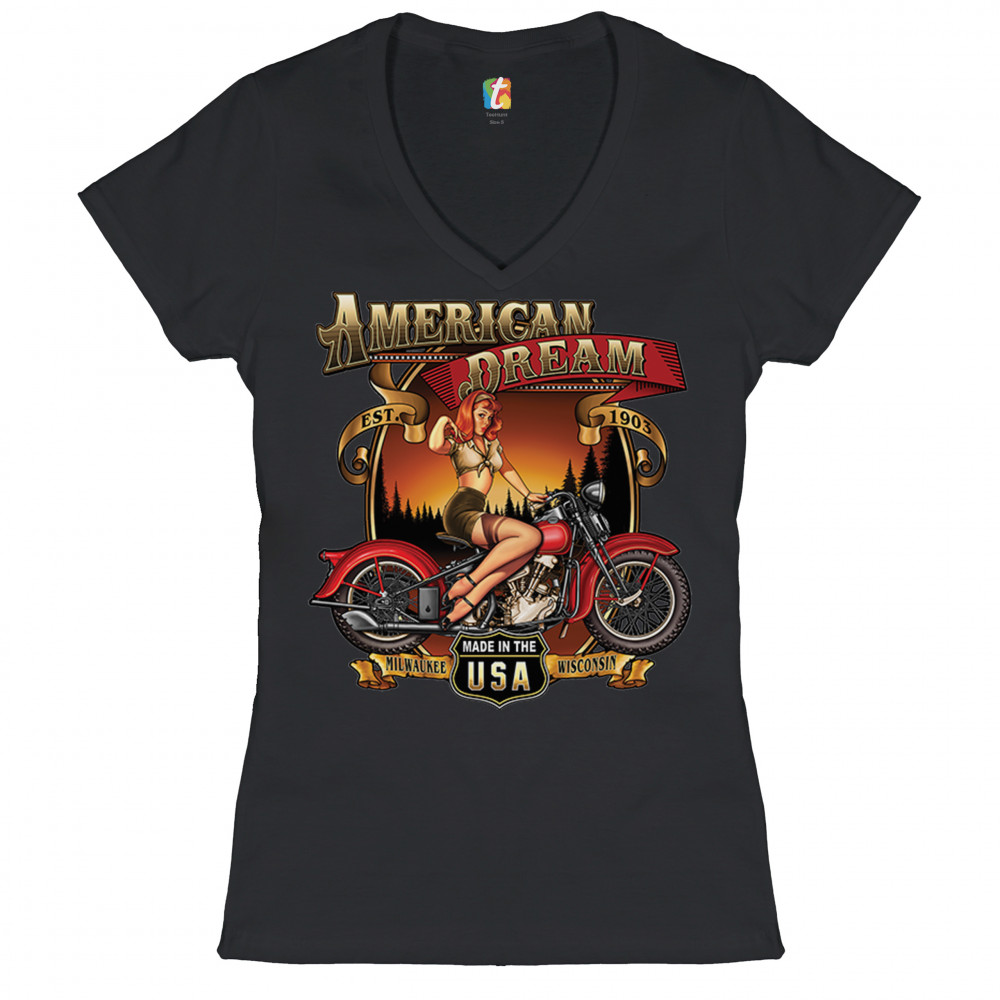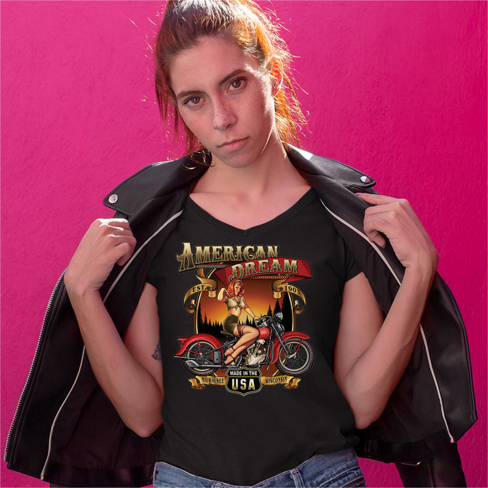 A print featuring a sexy pin up girl sitting on a vintage motorcycle. The print says: "American Dream est. 1903". In the bottom there is a sign saying: "made in the USA". To the left and right of it "Milwaukee Wisconsin" is written on a stripe. Great choice for any motorcycle enthusiast.