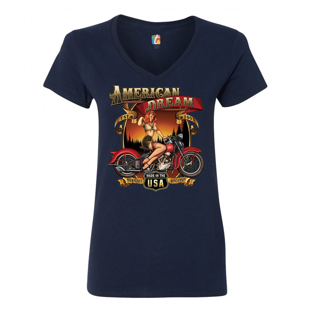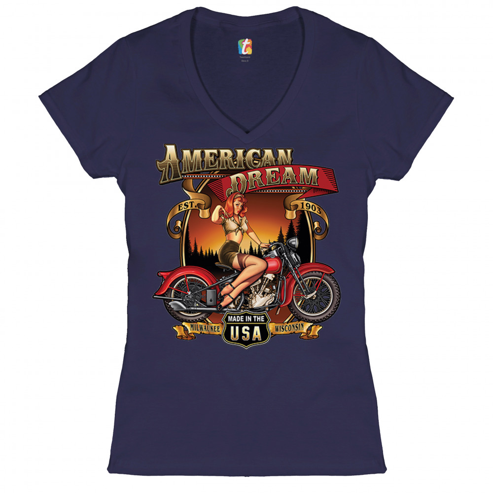 A print featuring a sexy pin up girl sitting on a vintage motorcycle. The print says: "American Dream est. 1903". In the bottom there is a sign saying: "made in the USA". To the left and right of it "Milwaukee Wisconsin" is written on a stripe. Great choice for any motorcycle enthusiast.