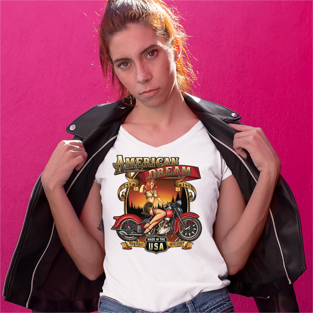 A print featuring a sexy pin up girl sitting on a vintage motorcycle. The print says: "American Dream est. 1903". In the bottom there is a sign saying: "made in the USA". To the left and right of it "Milwaukee Wisconsin" is written on a stripe. Great choice for any motorcycle enthusiast.