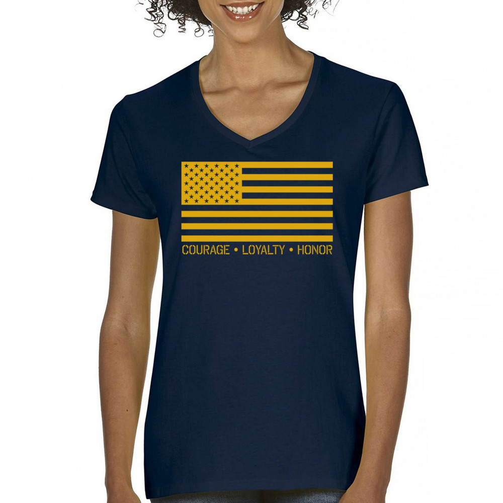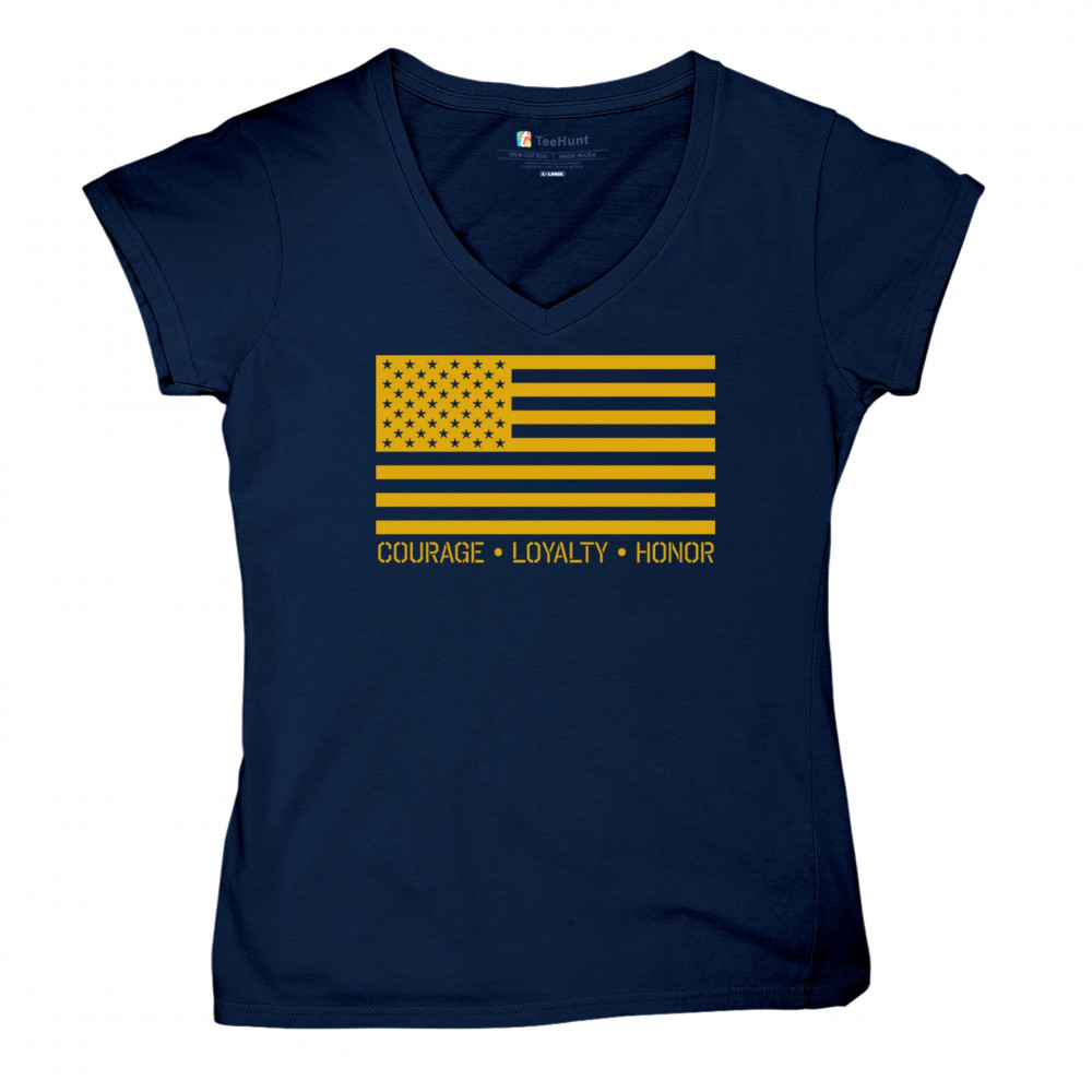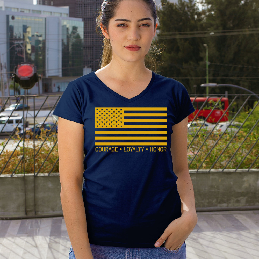 Honor the brave with our "Courage, Loyalty, Honor" USA flag shirt. Perfect for veterans and patriots. Ideal for Memorial Day and Veterans Day.